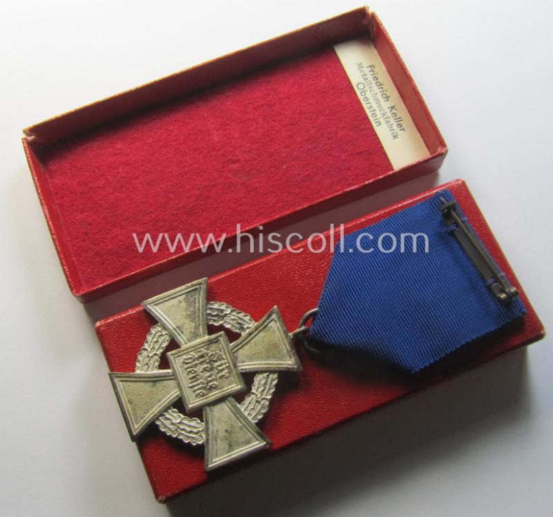 Neat, 'Treuedienst Ehrenzeichen 2. Klasse' being a non-maker-marked example that came mounted onto its original ribbon (ie. 'Bandabschnitt') and that came stored in its maker- (ie. 'Friedrich Keller'-) marked etui (ie. two-pieced box)