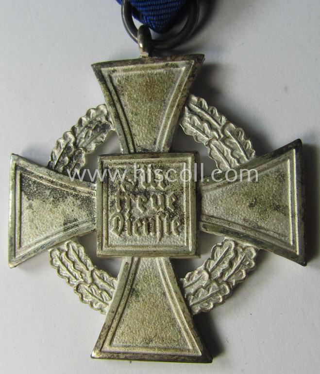 This is an attractive - and hardly used! - example of a so-called: 'Treuedienst Ehrenzeichen 2. Klasse' (or: silver-class, loyal-service-medal for 25 yrs. of loyal civil-service) being a non-maker-marked example that comes mounted onto its original ribbon (ie. 'Bandabschnitt') and that comes stored in its typical maker- (ie. 'Friedrich Keller - Oberstein'-) marked etui (ie. two-pieced box). The medal is a truly attractive piece that retains all of its period, bright-silver-coloured- and/or fairly 'frosted' finish: it also retains a fair bit of its 'off-factory applied': 'hochpolierte Kanten' (or: polished sides) but is just a tiny bit stained (it has never been cleaned). It comes mounted onto its cornflower-blue-coloured ribbon which still has its period (silverish-golden-toned) attachment-pin in place as was intended for wearing the medal on a tunic. The medal has I deem never been cleaned and has an immaculate (ie. fully undamaged) enamelled swastika(area). The medal came stored in its original, bright-red-coloured etui (ie. 2-pieced box) that shows some minimal staining (as can be seen on the pictures). This etui is fully undamaged but does just show some minimal (handling) age and/or staining (as can be seen on the pictures). Simply an attractive example that will be hard to be upgraded!