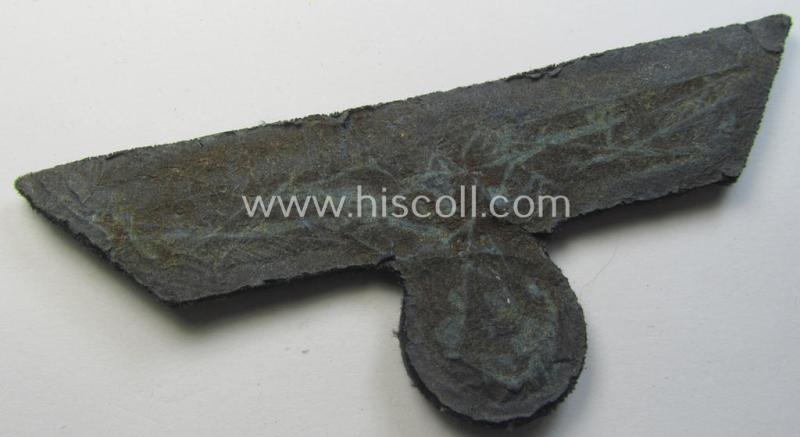 This is an attractive - and probably issued albeit never used! - example of a (luxuriously-styled!) WH (Heeres) officers'-type, hand-embroidered- (and quite detailed!) army-type breast-eagle (ie. 'Brustadler für Offiziere des Heeres') being executed in bright-silverish-coloured braid on a darker-green-coloured- and/or 'smooth'-woolen-based background and that comes in an overall very nice- (and as stated above 'virtually mint'-), condition. This example - having a length ie. 'wingspan' of approximately 11,2 cms. - is nicely hand-embroidered using (bright) silverish-coloured 'braid' on a darker-green-coloured (and/or woolen-based-) background and does show some 'high-lighted'-areas as executed in darker-green-coloured thread ie. braid (as can be seen on the pictures). The eagle - which is void of a makers'-designation as more often and that does show minimal handling-age only as can be noticed on the pictures - shows a neat additional 'backing' (made-out of black-toned- and thin-shaped paper as can be seen on the pictures). Simply an attractive example of a WH (Heeres) officers'-type breast-eagle of the 'Extra Qualität' that is accordingly priced!