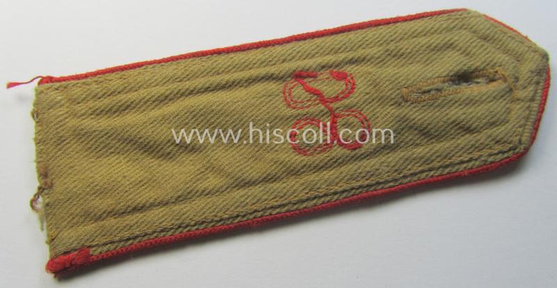 This is an attractive - albeit regrettably single but nevertheless not that easily found! - typical early-pattern, so-called: 'HJ'- (ie. 'Hitlerjugend'-) shoulderstrap as was intended for usage - and clearly worn! - by a: 'Hitlerjunge' who was attached to the: 'Oberbann I - Bann 80' (Bann 80 = 'Bann Wiesbaden' situated in the 'Gebiet West Hessen-Nassau') and that comes in an overall very nice- (I deem just moderately used- ie. carefully tunic- or shirt-removed-), condition. The strap - which is executed in typical, beige-tan-coloured linnen as to be expected - has the bright-red-coloured- (and rayon-based) piping attached and shows the machine-embroidered - by means of 'Kurbelstickerei' (and/or equally coloured) so-called: '80'-numerals (ie. 'Ziffern'). The strap never had a tongue attached and comes as found and/or issued: it is of 'sewn-in'-pattern (and was also used as such). The strap - that is void of an 'RzM'-etiket - measures 10,9 cms. in length and does show some minimal age ie. staining simply caused by minimal wear and/or decades of storage only. It should be noted that all 'cyphered' (ie. 'Hitlerjugend') shoulderstraps can easily be graded 'scarce' even more so when they are of the desirable early-pattern. Simply an attractive - and actually not that commonly encountered! - so-called: early-pattern, 'Oberbann I'-shoulderstrap that belonged to the 'HJ-Bann Wiesbaden' as was based in the 'Gebiet West Hessen-Nassau'!