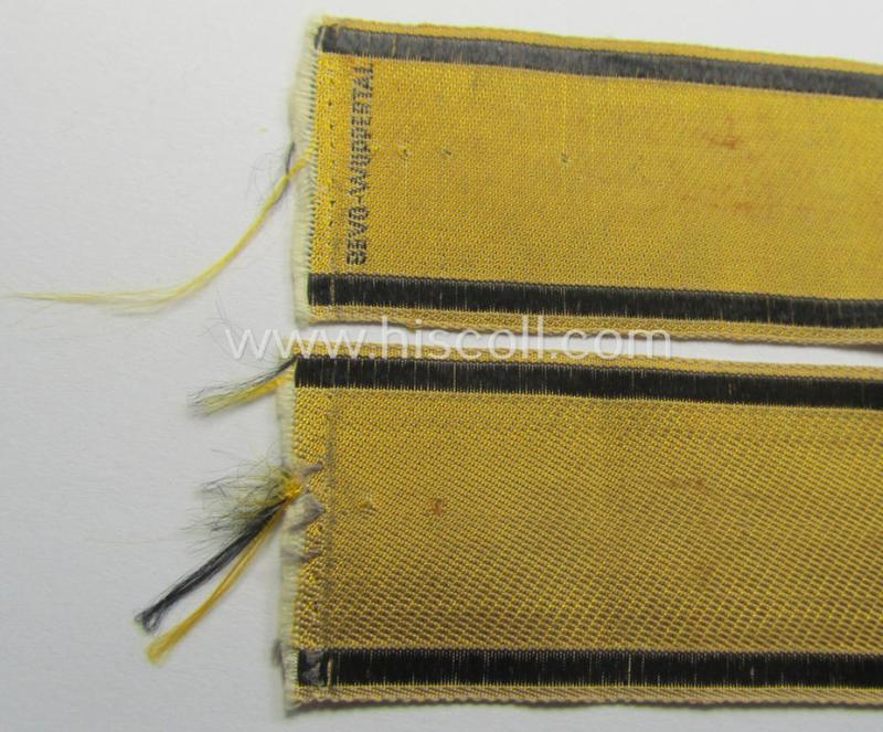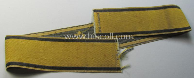 This is an attractive - truly worn and carefully tunic-removed and with certainty scarcely encountered! - WH (Heeres) female-related- and typical golden-yellow-coloured cuff-title (ie. 'Ärmelstreifen') entitled: 'NH des Heeres' as was worn by the various army-related 'Nachrichtenhelferinnen' (or: female signals-staff) and that comes in an overall very nice- (albeit clearly used- and/or carefully tunic-removed-), condition. The cuff-title - depicting the interwoven, black-coloured characters and two side-stripes on a typical, golden-yellow-coloured- and linnnen-based background - is beautifully executed in the neat 'BeVo'-weave-pattern and also shows the interwoven 'BeVo-Wuppertal'-logo as to be expected (as can be seen on the pictures). As stated above, comes this particular specimen in a full-length- (ie. non-shortened!) condition and measures approximately 34,5 cms. in length: it has two unfinished ends ie. does show some minimal fraying and shows some minimal stitching-remains (as is more is often encountered). Simply a very attractive - and with certainty scarcely encountered! - female-related 'Heeres'-related item!