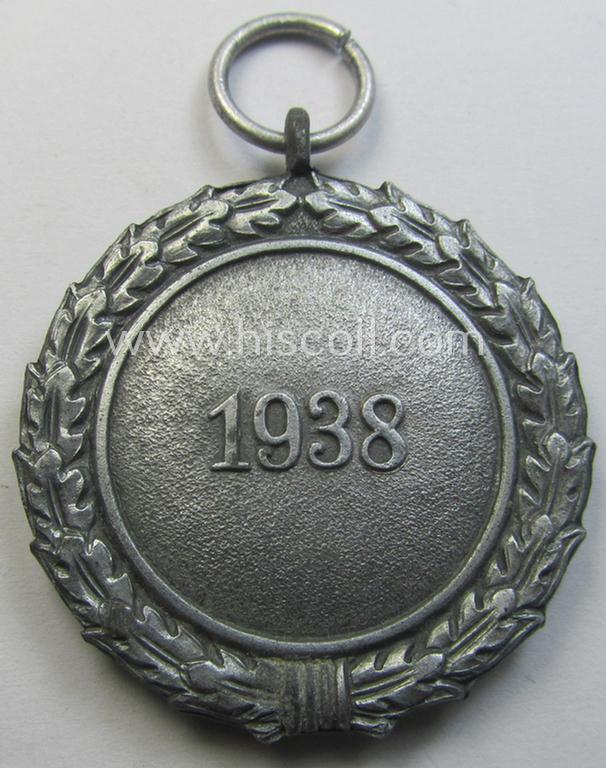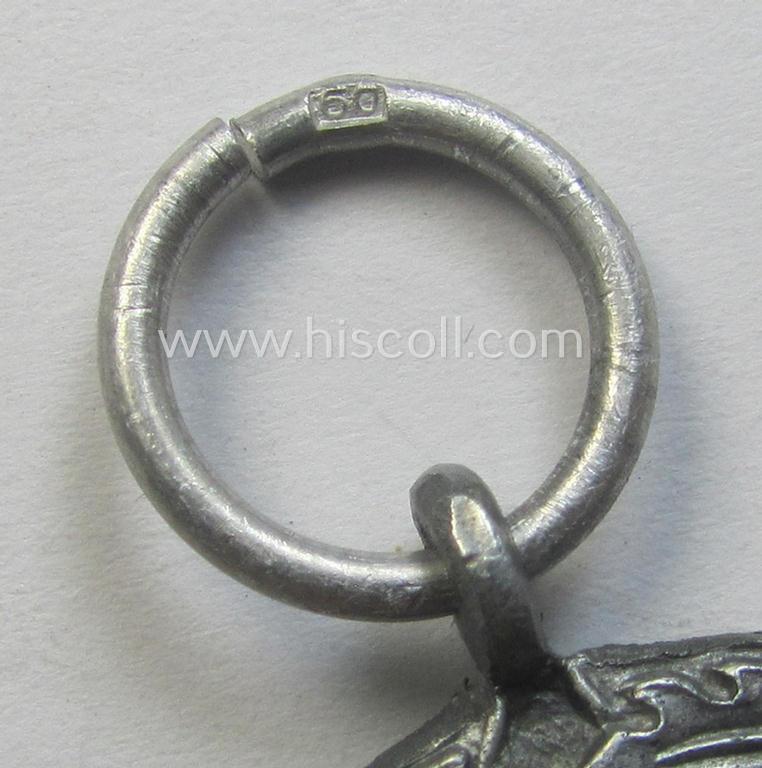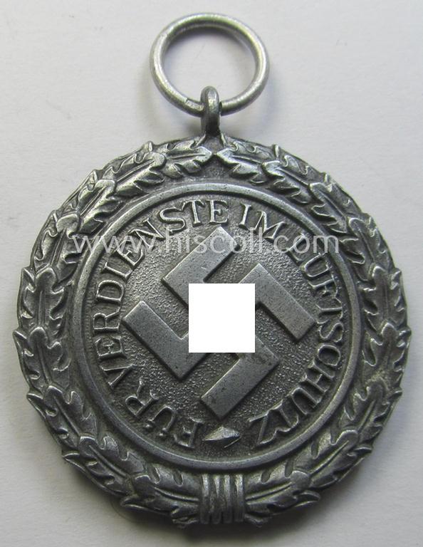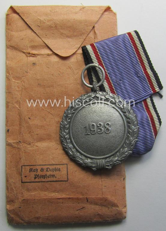 This is a truly very attractive - and in such completely untouched condition fairly unusually seen! - example of 'Luftschutz-Ehrenzeichen 2. Stufe' (or: air-raid warden medal 2nd class) being a neatly maker- (ie. '60'-) marked- and/or regular-weight-version as was executed in (bright and somewhat shiny) silver-toned, zinc-based metal (ie. 'Feinzink') and that comes stored in its original, carton- (ie. Zellstoff-) based pouch as was produced by the maker: 'Katz u. Deyhle' and that comes in an overall very nice- (albeit I deem issued- albeit hardly worn nor used-), condition. This example comes together with its original (minimally confectioned, folded and/or approximately 19 cms. long-sized) ribbon as found and issued. The medal was most certainly issued but hardly worn (it shows some dust and dirt simply caused by years of storage only) but retains great pronounced detail without showing any defaults. The award comes mounted on its aluminium-based ring that shows the makers-mark: '60' (clearly denoting that this is a medal that was produced by the medal-producing company: 'Katz u. Deyhle' based in the town of Pforzheim). The pouch - which is scarcely seen in itself! - shows a printed makers'-mark on its back (that also reads: 'Katz u. Deyhle - Pforzheim'). The pouch comes also in an overall nice - and of course fully functional - condition: it just shows some minimal staining. I deem that the sets' comparative scarcity justifies my asking-price. It will be very difficult to upgrade this untouched set!