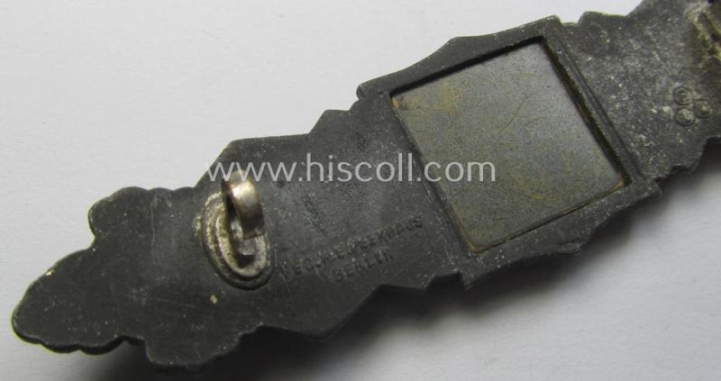 This is an attractive - and I deem just moderately worn- and/or used! - example of a so-called: 'Nahkampfspange in Silber' (or: silver-class close-combat clasp ie. CCC) being a clearly maker- (ie. 'FLL'-) marked and/or (typical) quite converse-shaped, so-called: 'third pattern'-specimen as was produced by the maker- (ie. 'Hersteller') 'Friedrich Linden' and that comes in an overall nice- (I deem just moderately used ie. worn-), condition. The piece - which has a very detailed and/or pronounced appearance - has lost most of its (light-toned) silver-coloured finish (it is somewhat 'migriert' over the years as more often) and naturally retains its firmly 'crimped' and metal-based 'back-plate' (as can be seen on the pictures). The 'Spange' is as stated a truly converse-shaped example that comes mounted onto its (functional- and/or silver-coloured) flute-shaped pin (and/or typical 'thin-shaped-wire'-type catch- ie. crimped-in catch-set-up) both which are of course still present, unaltered and/or fully functional. A similar example is also described in the excellent reference-book entitled: 'The German Close Combat Clasp of World War II' by Thomas M. Durante wherein this particular pattern is given the unique reference-numeral: '2.5 - 'FLL Fat-Bellied Pin - 3rd'-pattern. The piece was found as such at a private-household in Germany and was never before part of a collection. Simply an attractive example of a silver-class 'Nahkampfspange': it should be noted that original examples of this neat - and fairly uncommon combat-award! - are nowadays getting hard to find. I deem that I have priced this neat silver-class example, accordingly!