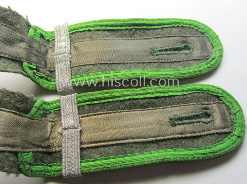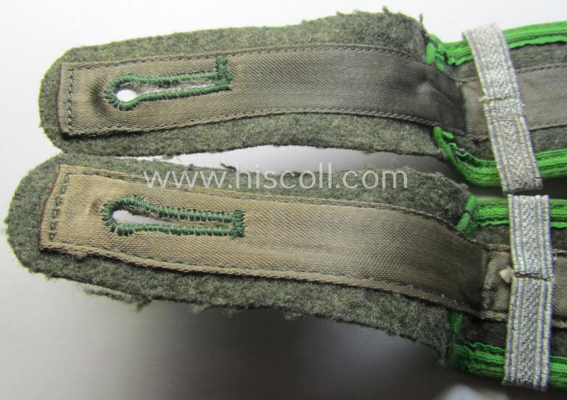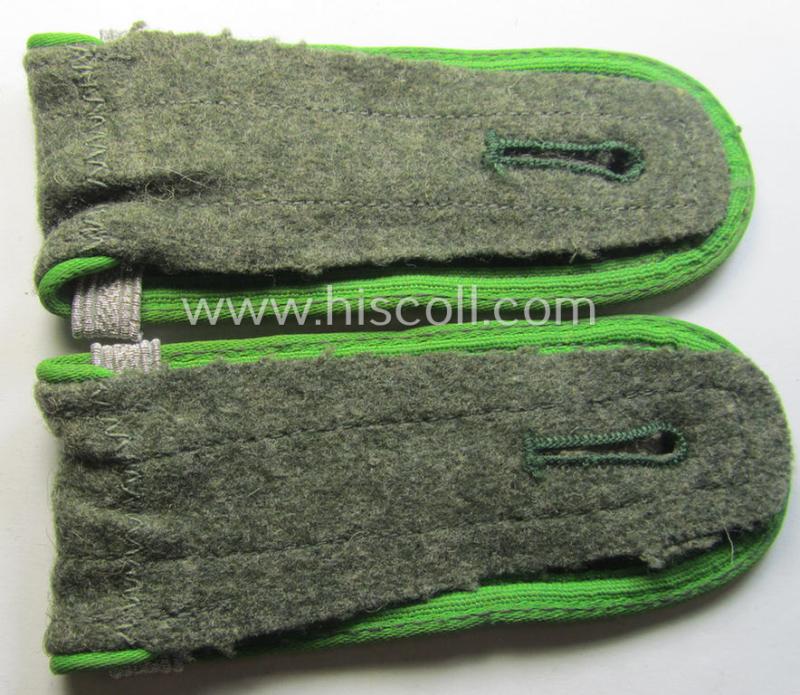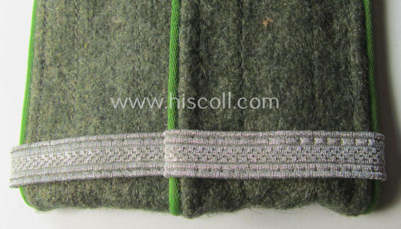 This is an attractive - fully matching and (I deem) just minimally used ie. worn - pair of typical, later-war-period, WH (Heeres) so-called: 'M44'-styled (ie. 'simplified') enlisted-mens'-type shoulderstraps as was piped in the neat bright-green- (ie. 'wiesen- o. hellgrüner'-) coloured branchcolour as was intended for a: 'Soldat u. Unteroffiziers-Anwärter eines Panzergrenadiere-Regiments' (or: simple soldier and NCO-candidate who served within a later-war-period, infantry-related so-called: rifle-regiment) and that comes in an overall very nice- (ie. I deem just minimally used- ie. worn-), condition. The straps - which are approximately 11 cms. sized in length each - have the 'standard-pattern'- and/or typical, field-grey- (ie. somewhat earthen-brown-) coloured and/or woolen-based 'upperdecks' and show the neat bright-green- (ie. 'wiesengrüner'-) coloured and/or: 'silk-like'-type branchcolour (ie. piping) attached. The straps are constructed following the typical '1944 cloth-minimising production-manner' using different shades of wool and/or material (as can be seen on the pictures). Of interest is, moreover, the fact that the straps show each a (single-pieced, bright-silver-toned) loop (ie. 'Lasche') period-atttached (denoting the soldiers rank ie. function of a: 'Soldat u. Unteroffiziers-Anwärter eines Panzergrenadiere-Regiments'. The straps show some minimal staining simply caused by minimal wear and/or decades of storage only. It should be noted that all 'M44'-style, EM-pattern shoulderstraps are actually quite hard to encounter and can easily be graded 'scarce': the ones as intended for the 'Panzergrenadier-Truppen' even more so! Simply a nice occasion to acquire an attractive - and fully 'text-book'! - M44-styled, enlisted-mens'-type shoulderstrap-pair as was intended for usage by 'Soldat u. Unteroffiziers-Anwärter eines Panzergrenadiere-Regiments': great to complete any later-war M44- (ie.even M43-) model 'Heeres'-tunic!