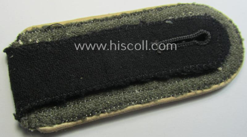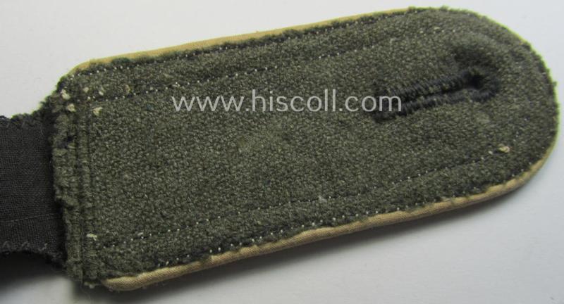 This attractive - and I deem just moderately worn, albeit regrettably single! - Waffen-SS, NCO-type shoulderstrap shows the neat white- (ie. 'weisser'-) coloured branchcolour and/or typical 'silk-like'-type piping attached and was as such worn by an SS-member ie. NCO holding the rank of: 'SS-Unterscharführer der Infanterie-Truppen' (or: junior-sergeant who served within the SS-infantry-troops). The strap - that shows the 'standard-issue'-pattern, silver-toned NCO-braid attached - is in all facets a fully 'text-book' and (I deem) mid-war- (ie. somewhat later-period) SS-strap and does show the moderate signs of having been used and/or worn as such. The shoulderstrap - that measures approx. 11 cms. sized in length as more often encountered - shows some moderate age and or staining simply caused by moderate wear and/or usage. The strap shows a (typical) thinner-shaped tongue attached (as observed on genuine Waffen-SS-pattern straps!) and does show a field-grey-coloured and woolen-based underlay (as can be noticed on the pictures). It should be noted that these original, period Waffen-SS, NCO-type shoulderstraps can nowadays easily be graded 'scarce': even more so when they are piped in the not that commonly encountered, white-coloured- (ie. 'SS-Infanterie-Truppen'-related-) branchcolour. I deem that this attractive and textbook Waffen-SS, NCO-type shoulderstrap is accordingly priced!