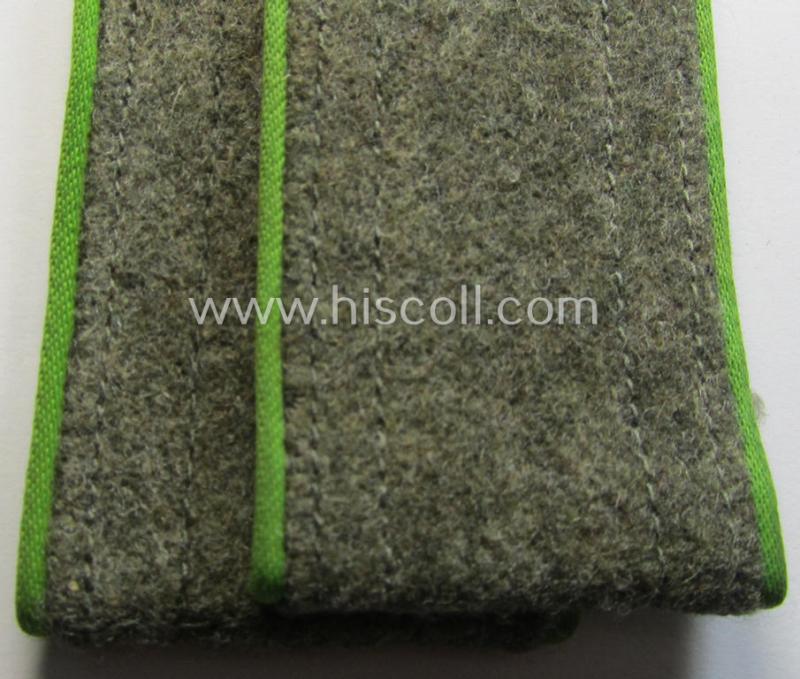 This is an attractive - fully matching and (I deem) just minimally used ie. worn - pair of typical, later-war-period, WH (Heeres) so-called: 'M44'-styled (ie. 'simplified') enlisted-mens'-type shoulderstraps as was piped in the neat bright-green- (ie. 'wiesen- o. hellgrüner'-) coloured branchcolour as was intended for a: 'Soldat der Panzer-Grenadier-Truppen' (or: simple soldier who served within a later-war-period, infantry-related so-called: rifle-unit) and that comes in an overall very nice- (ie. I deem just minimally used- ie. worn-), condition. The straps - which are approximately 11 cms. sized in length each - have the 'standard-pattern'- and/or typical, field-grey- (ie. somewhat earthen-brown-) coloured and/or woolen-based 'upperdecks' and show the neat bright-green- (ie. 'wiesengrüner'-) coloured and/or: 'silk-like'-type branchcolour (ie. piping) attached. The straps are constructed following the typical '1944 cloth-minimising production-manner' using different shades of wool and/or material (as can be seen on the pictures). The straps show some minimal staining simply caused by minimal wear and/or decades of storage only. It should be noted that all 'M44'-style, EM-pattern shoulderstraps are actually quite hard to encounter and can easily be graded 'scarce': the ones as intended for the 'Panzergrenadier-Truppen' even more so! Simply a nice occasion to acquire an attractive - and fully 'text-book'! - M44-styled, enlisted-mens'-type shoulderstrap-pair as was intended for usage by a: a: 'Soldat der Panzer-Grenadier-Truppen': great to complete any later-war M44- (ie.even M43-) model 'Heeres'-tunic!