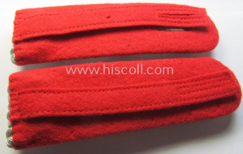 The truly attractive pair is piped in the bright-red- (ie. 'hochroter'-) coloured branchcolour: as such, the pair was intended for usage by a an officer ie.: 'Oberleutnant eines Flak-Artillerie-Abteilungs o. Regiments' (or: lieutnant first-class who served within a specific anti-aircraft-unit). The pair was presumably issued and moderately used ie. once tunic-attached and comes in an overall very nice condition. The shoulderboards - which are constructed from the bright-red- (ie. 'hochroter'-) coloured, 'smooth-type' (ie. moleskin-like) wool - come in an excellent condition overall and will be hard to be upgraded (the pair is fully matching as can be seen on the pictures). The fairly 'shiny' appearance of the 'upperdecks' is fully present and/or preserved (something that is to be expected with a Luftwaffe-related pair). The boards - that come mounted onto their smaller-sized officers'-pattern tongues - are just a tiny bit 'tarnished' by normal age and/or storage for decades (as can be seen on the pictures). The boards - which measure approximately 11,7 cms. in length each - show two (fully-matching, regular-sized, golden-toned and unusually-seen glass-based!) pips period-attached denoting the officers'-rank ie. function of an: 'Oberleutnant eines Flak-Artillerie-Abteilungs o. Regiments' (of additional interest is moreover the fact that all four pips were attached BEFORE the boards were fully assembled). The straps only show some storage-age and are void of any damage or alike. Simply a great occasion to acquire an attractive, officers'-type LW-shoulderstrap-pair that was intended for an: 'Oberleutnant eines Flak-Artillerie-Abteilungs o. Regiments'!