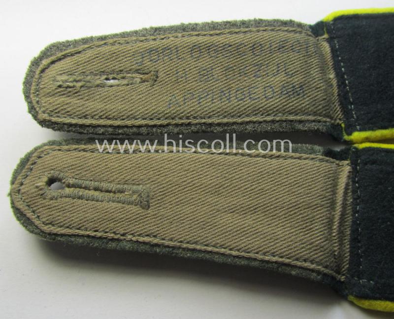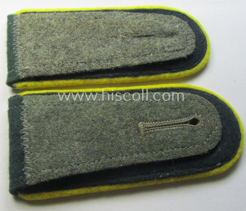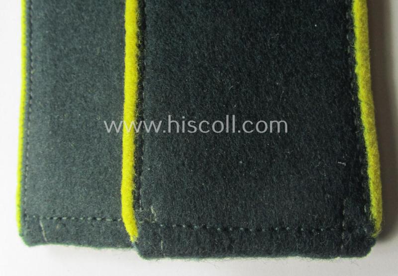 This is an attractive - and not that easily found! - pair of WH (Heeres), early- (ie. pre-war-) period, so-called: 'M36- o. M40'-pattern, bright-yellow- (ie. 'zitronengelber'-) piped enlisted-mens'-type shoulderstraps as was intended for - and minimally worn by! - a: 'Soldat der Nachrichten-Truppen' (or: simple soldier who served within an army signals-unit) and that comes in an overall nice- (albeit just moderately used ie. worn-), condition. The somewhat smaller-sized shoulderstraps - which are approximately 9,7 cms. sized in length - have the 'standard-type'- and/or darker-green-coloured, smooth-woolen-based 'upperdecks' and show the bright-yellow- (ie. 'zitronengelber'- and/or: woolen-type) piping, attached. The straps - that come mounted onto their period tongues - show as stated above only moderate usage and/or wear and are just minimally stained (one of the straps shows a post-war ink-stamp of a Dutch collector). Simply an attractive and/or: early-war-period, 'Heeres'-related EM-type shoulderstrap-pair that was intended for usage by a: 'Soldat der Nachrichten-Truppen'!