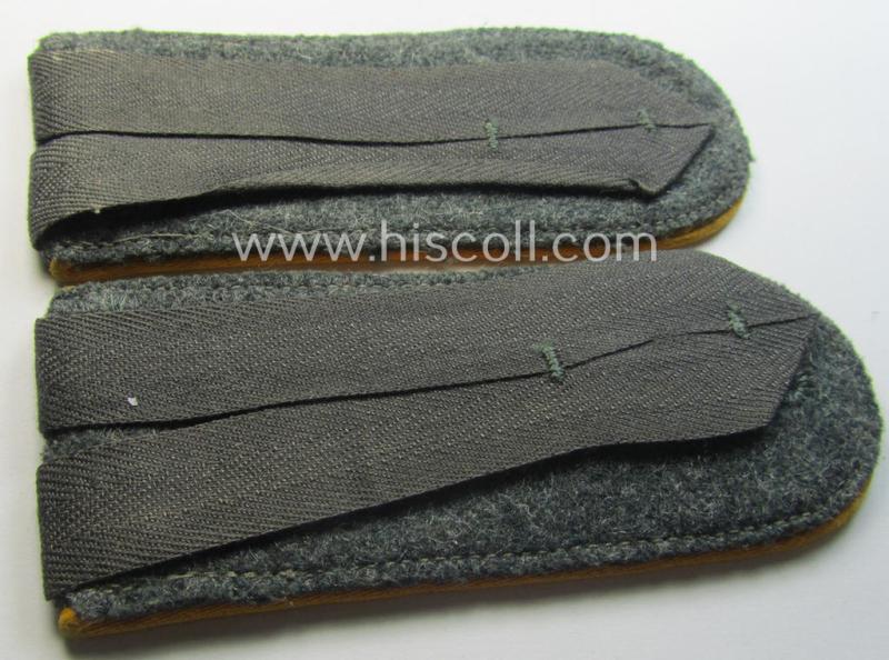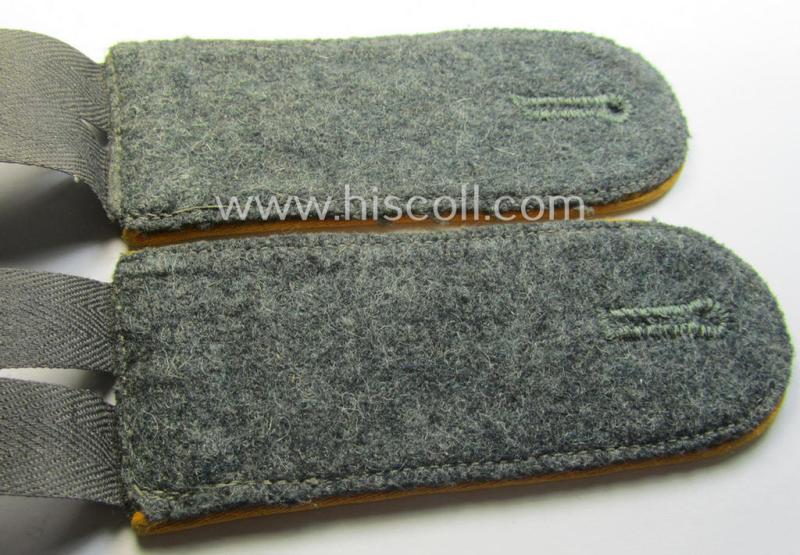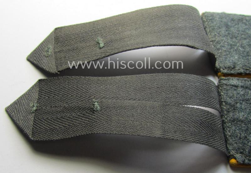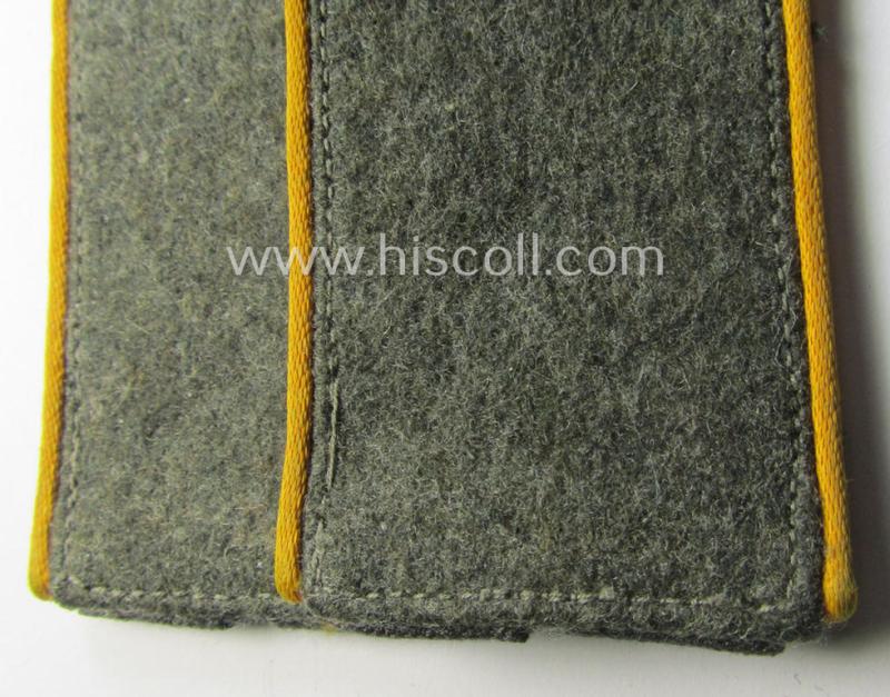The truly attractive - and with certainty very scarcely seen! - WH (Heeres) shoulderstraps show the desirable golden-yellow- (ie. 'goldgelbener'-) coloured branchcolour and/or: typical 'silk-like'-type piping attached and measure approximately 11,4 cms. in length each and are clearly of the so-called: simplified- (ie. 'last-ditch'- or: 'M44/M45'-) pattern. The neat shoulderstraps are matching in all details and are constructed from the (field-grey-toned- and/or quite roughly-executed) so-called: later-war-type wool (the backs are constructed from so-called: 'drap Orti' as can be seen on pictures). The straps come naturally mounted onto their simplified tongues and do show some minimal usage and/or wear (as can be seen on the pictures). It should be noted that these matching pairs of these golden-yellow-piped- thus 'Kavallerie o. Aufklärungs'-related and/or typical later-war period- (ie. 'simplified'- ie. 'M44/M45'-pattern) enlisted-mens-type shoulderstraps are very desirable and can easily be graded 'very scarce'. I am convinced that this attractive - and truly very scarcely seen! - WH (Heeres) shoulderstrap-pair is accordingly priced!