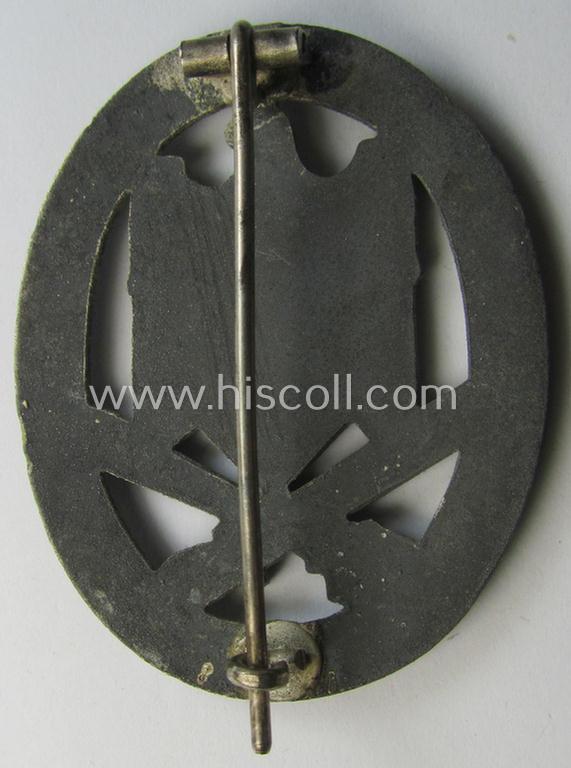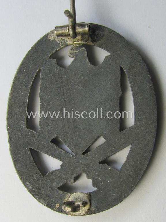 This is an attractive - and I deem only moderately used ie. worn - example of an: 'Allgemeines Sturmabzeichen' (or: General Assault Badge ie. GAB) being a non-maker-marked, zinc- (ie. 'Feinzink'-) based so-called: 'flat-back-variant' as was (presumably) produced by the (desirable!) maker (ie. 'Hersteller'): 'C.E. Juncker' as was based in the town of Berlin and that comes in an overall very nice- (albeit just moderately used ie. worn-), condition. The badge is typical zinc- (ie. 'Feinzink'-) based example that has lost most of its silver-coloured finish: it has 'migriert' over the years and has a typical zinc-like age-patina (as can be seen on the pictures). This particular example comes naturally mounted onto its functional (thin-shaped- and/or silver-coloured) pin (which is mounted on a typical 'mounting' and/or 'welded-on', round-shaped catch(plate) as is more often seen). The piece is still very detailed and has a very pronounced appearance: the award has as stated above only moderately been used and shows some minimal wear on the obvious higher areas but was most certainly never cleaned nor polished. It originated from a private-household in Germany and was never before in collectors'-hands. I deem that this particular example can be attributed to the desirable maker: 'C.E. Juncker' as was based in the town of Berlin. In any case an attractive and honest GAB-variant that is with certainty accordingly priced!