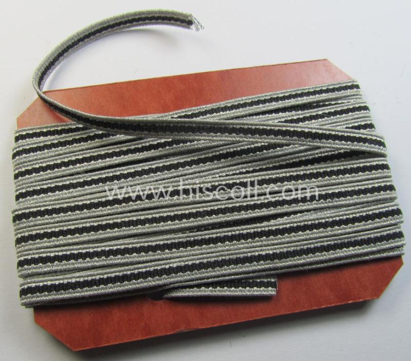 I recently encountered once more a length (measuring approximately 3 meters!) of the neat - and truly scarcely encountered! - 'SS'- (ie. 'Waffen-SS'-type-) bright-silver-coloured- and/or black-centered (enlisted-mens', NCO- ie. officers'-type-) 'rank-braid' as was specifically intended for the rank-designation onto the black-coloured- (woolen- and/or: linnen 'BeVo'-woven-) 'SS'-rank-collar-tabs and that comes in a wonderful- (ie. 'virtually mint- ie. unissued'-), condition. The (period-) card that I found held approximately 3 meters and originated from the left-overs of an old tailor-shop: I decided to sell this desirable braid as single pieces, measuring approximately 10 cms. in length each. I know by experience that finding an original and period piece of this specifically woven-braid can be extremely difficult and hard. The pieces - which as stated above have an approximate length of 10 cms. - is naturally largely sufficient to 'promote' ie. restore any collar-tab (ie. collar-tab pair). It naturally deals with 100% original, period-produced 'rank-braid' and not being a modern copy or worse. The pieces shows some truly minimal tarnish, simply caused by decades of storage only. The asking-price is as stated above for ONE single piece, measuring approximately 10 cms. Simply a very nice and hard to encounter SS-insiginia-accesory!