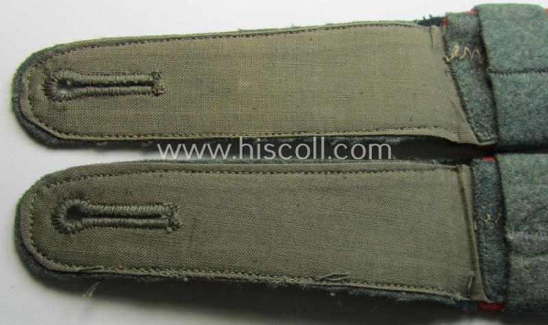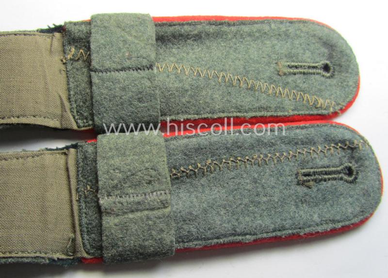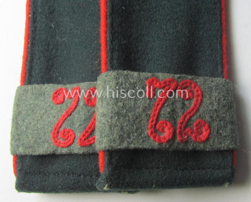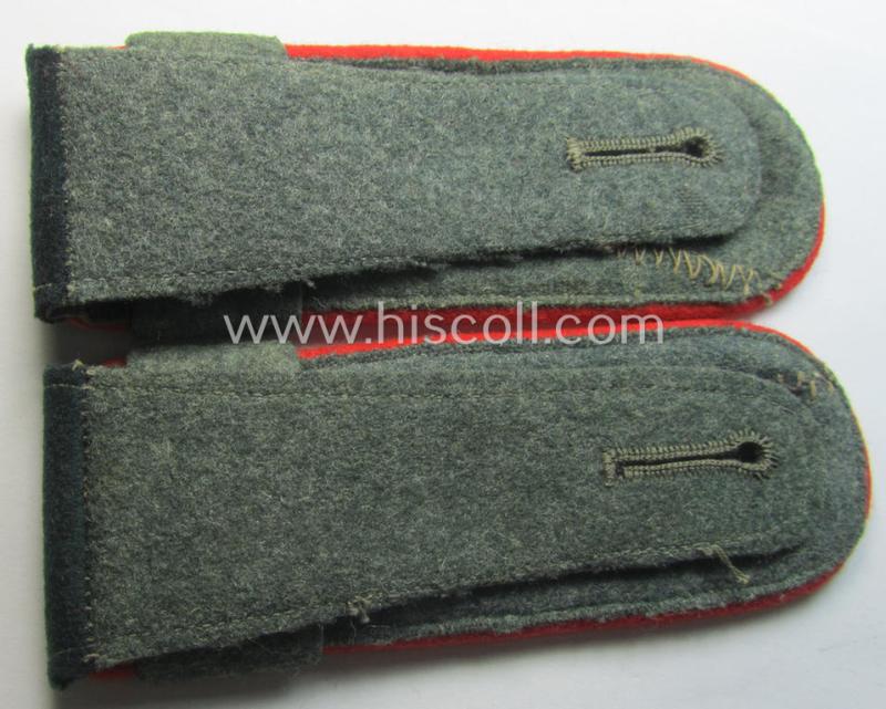 This is an attractive - fully matching and (I deem) just moderately used - pair of early- (ie. pre-)war-period and/or rounded-styled, WH (Heeres) so-called: 'M36- o. 'M40-styled', enlisted-mens'-type shoulderstraps as was piped in the neat bright-red- (ie. 'hochroter'-) coloured branchcolour and having a pair of (regular-styled) so-called: 'Schulterstück-Überschuben' period-attached as was intended for a: 'Soldat des Artillerie-Regiments 72' (or: simple soldier who served within the artillery-regiment, numbered: '72') and that comes in an overall very nice- (ie. I deem just minimally used- ie. worn-), condition. The straps - which are approximately 13 cms. sized in length each - have the 'standard-pattern'- and/or typical, darker-green-coloured and/or woolen-based 'upperdecks' and show the neat bright-red- (ie. 'hochroter'-) coloured and/or: woolen-type branchcolour (ie. piping) attached (as can be seen on the pictures). The straps - which are of the 'standard-issued'- ie. non-private-production - show some minimal staining simply caused by minimal wear and/or decades of storage. Of additional interest is, moreover, the fact that this pair came with a (fully matching) pair of (field-grey-coloured- and/or woolen-based) so-called: shoulderstrap-slip-ons (ie. 'Schulterstück-Überschuben') period-attached bearing both the unit-designation: '72' (as executed in equally bright-red-coloured, so-called: 'Kurbelstickerei' done in wool as can be seen on the pictures). Simply a nice occasion to acquire an attractive - and fully 'text-book'! - 'M36- o. 'M40-styled', enlisted-mens'-type shoulderstrap-pair as was intended for usage by a: 'Soldat des Artillerie-Regiments 72': great to complete any early- or: pre-war 'Heeres'-tunic!
