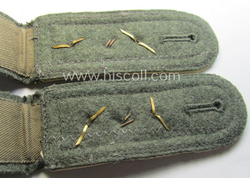 This is a truly very attractive - and actually quite rarely encountered! - pair of WH (Heeres), early- (ie. mid-) war-period- (ie. 'M41 o. M43'-pattern) NCO-type shoulderstraps as piped in the desirable, white- (ie. 'weisser'-) coloured branchcolour as was intended for - and I deem just moderately used by! - an: 'Oberfeldwebel eines Ersatz-Infanterie-Regiments' (or: senior-NCO ie. sergeant first-class who served within a specific replacement, infantry-regiment) and that comes in an overall very nice- (and I deem just minimally used ie. worn-), condition. The neat straps - which I deem are of the early- (ie. mid-war-) period ie. so-called: 'M41 o. M43'-pattern - have the field-grey-coloured 'upperdecks' and have the neat, white- (ie. 'weisser'-) coloured and/or 'silk-like'-type piping attached (as can be seen on the pictures). The tongues are naturally also present. The straps - which are regular-sized and that measure 12,2 cms. in length each - show the neat, non-sub-dued- (ie. bright-silver-coloured- and/or 'standard'-pattern- ie. 'Heeres-type'-) NCO-braid and a pair of (scarcely seen!) greyish-silver-toned (Gothic-styled, smaller-sized and/or zinc- ie. 'Feinzink'-based) so-called: 'E'-cyphers (ie. 'Ziffern') and two pairs of (smaller-sized and also zinc-based) pips period-attached denoting the NCO's rank of an: 'Oberfeldwebel'. This rarely seen pair originated from an older and extensive shoulderstrap-collection I recently acquired for the web-site. The pair on offer here just shows some truly minimal age, wear and or staining (as can be seen on the pictures). Simply a very attractive - and fully 'text-book'! - 'Infanterie-Ersatz'-related NCO shoulderstrap-pair that will be very hard to be upgraded and that is (I deem) accordingly priced!