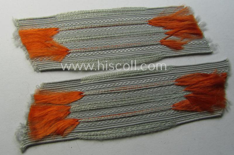 The neat - 'all-linnen'-based and/or fully matching! - pair of 'Gendarmerie' (ie. police) mid- (ie. later-) war-period- and/or: 'standard-issued'-pattern collar-tabs (or: 'Einheitskragenspiegel für Mannschaften u. Unterführer der Gendarmerie') being of the desirable 'generic-pattern' which are piped in the typical, bright-orange-coloured (ie. 'generic'-style) branchcolour having an equally bright-orange-coloured 'centre-stripe'and were as such intended for usage by all soldiers (ie. NCOs) within all 'Gendarmerie'-related branches of the: 'Deutsche Wehrmacht' troughout the war. The tabs come in an overall very nice- (ie. 'virtually mint- ie. unissued'-) condition and were simply never used- nor tunic-attached (as can be seen on the pictures). Both tabs just show some minimal storage-age only and came as 'straightly cut-off the role' (as can be seen on the pictures). These pairs saw wide-spread usage throughout the 'Deutsche Wehrmacht' and were directly sewn to the collar (without having a 'backing'). As such is the set on offer here a great pair to complete any police-tunic or to be simply stored in any insignia-collection!