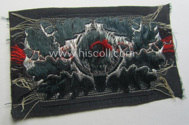 This is an attractive - simply never used and actually not that easily encountered! - WH (Heeres) officers'-type visor-cap-cocarde (as executed in so-called: 'flat-wire'- ie. 'BeVo'-weave pattern) as was specifically intended for usage on the: WH 'Knautschmützen' ie. 'Alter-art'-visor-caps (ie. 'Schirmmützen') and that comes in an overall nice- (ie. simply never visor-cap-attached- ie. 'virtually mint'-), condition. The piece was never pre-folded nor confectioned (as can be seen on the pictures). The piece - also known in German language as: 'Kokarde für Knautsch- oder Alter-Art-Schirmmütze' - is executed in the so-called: 'BeVo'-weave, 'flat-wire'-pattern as to be expected and shows some age ie. staining simply caused by decades of storage only: it can, however, naturally easily serve to restore any 'Knautschmütze'. Simply a neat - and 'virtually mint'- example that is I deem accordingly priced!