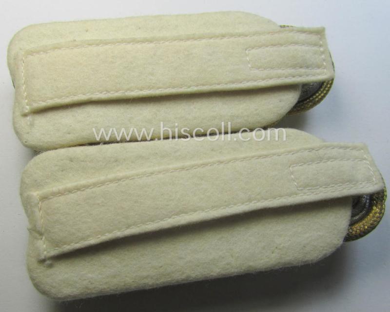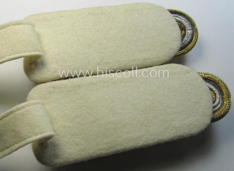 This is a truly very attractive - and fully matching! - pair of (I deem somewhat later-war-period and I deem simply never worn!) WH (Luftwaffe) general-officers'-pattern shoulderboards (ie. 'Schulterstücke für Generale der Luftwaffe') as was intended for a general-officer holding the rank of: 'General der Flieger' (or other branch!) and that comes in an overall very nice- (ie. presumably issued- albeit simply never worn- nor used-), condition. The neat shoulderboards - which both show an 'upperdeck' that is executed in golden- and/or silver-coloured- (ie. I deem somewhat later-war-type) 'braid'-based material - measure approx. 10,5 cms. in length each and show a beige-white-coloured- and/or 'smooth'-woolen-based 'underground' as to be expected. The boards come mounted onto their smaller-sized tongues attached (as can be noticed on the pictures). The boards show two pairs of (bright silver-toned, typically somewhat larger-sized, 'Buntmetall'-based) pips attached and was thus a pair that was intended for a general-officer with the (high!) general-officers' rank of a: 'General der Flieger' (or other branch). Of additional interest is, moreover, the fact that the four pips where attached BEFORE the set was entirely assembled. The boards show truly extraordinary detail and are a great example of the employed craftmenship of the days. The pair is just a tiny bit tarnished ie. stained (simply caused by years of storage ie. moderate wear). The pair belonged to an (regrettably unidentified) airforce 'General' who kept and/or stored these neat insignia-pieces for decades. Simply a very attractive and/or truly detailed WH (Luftwaffe) general-officers'-type shoulderboard-pair that is with certainty priced according to its desirability and rarity!