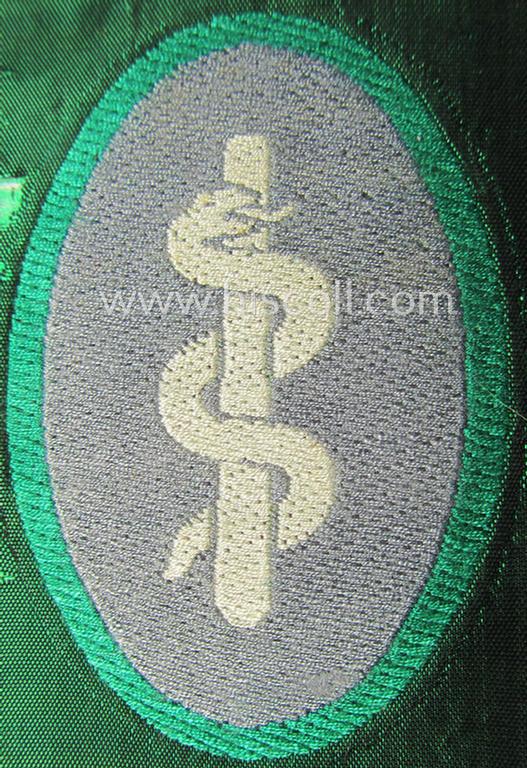 This is a truly attractive - and actually very scarcely encountered! - example of a neatly 'BeVo'-woven, so-called: 'Sicherheits- u. Hilfsdienst' (ie. 'SHD'-) armbadge (ie. 'Ärmelabzeichen') being a greyish- (ie. white/green-) coloured example depicting an: 'Aesculapus'-symbol as was intended for a member serving as a: 'Feldscher' (ie. 'SHD-Sanitäter' or: medical-orderly) and that comes in an overall very nice- (ie. 'virtually mint- ie. unissued'-), condition. The badge - which depicts a white-coloured, 'Aesculapus'-symbol onto a greyish- (and green-rimmed) coloured background - was introduced in late 1941 and was one of a series of - at least - six different such SHD speciality- ie. trade-badges. These 'specialist' badges were worn on the left upper-arm. The piece on offer here comes in a truly 'virtually mint- ie. unissued'- (and of course fully unconfectioned-), condition: it just shows some (non-disturbing) damage on its background (as can be noticed on the pictures). Simply an attractive - and actually scarcely encountered! - 'SHD'-arm-patch as was used by one of the lesser known TR-organisations!