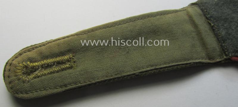This is a truly attractive - albeit regrettably single but nevertheless truly rarely encountered! - (I deem) early-pattern, WH (Heeres) 'tropical' (ie. DAK- or 'Deutsches Afrikakorps'-related!), enlisted-mens'-type shoulderstrap as was piped in the neat bright-pink- (ie. 'rosaroter'-) coloured branchcolour as was specifically intended for - and with certainty worn by! - a: 'Soldat der Panzer-Truppen' (or: simple doldier who served within an army, tank ie. Panzer-related regiment or unit) and that comes in an overall nice- (albeit clearly used- and or obviously worn- and minimally damaged-), condition. The neat shoulderstrap - which measures approximately 11 cms. in length - has the neat bright-pink- (ie. 'rosaroter'-) coloured and/or desirable 'silk-like'-type piping attached and comes mounted onto its functional tongue as issued and/or most certainly worn. The strap comes in a fully 'text-book' condition and has a 'greenish-brown'- ie. tan-coloured and/or linnen-based 'upperdeck'. The strap is also 'backed' with field-grey-coloured wool, something that is more often encountered with genuine, tropical ie. DAK- (or 'Deutsches Afrikakorps'-) related shoulderstraps. The strap was clearly worn and does show (as mentioned above) a damaged area within the piping. It has never been cleaned and still shows some dirt ie. staining as caused by years of storage. As most certainly known are most DAK-shoulderboards offered on todays' market regrettably copies: this is naturally a fine and 100% genuine, period piece for which I give a life-time garuantee (as always). Simply a superb - and as most certainly known rarely encountered! - tropical-pattern, 'Panzer'-related EM-type shoulderstrap: too bad that it is only a single specimen!