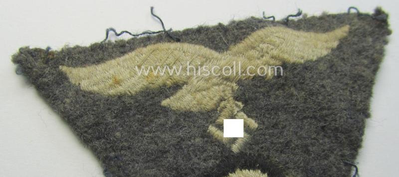 This is an attractive - and actually fairly scarcely encountered! - WH (Luftwaffe) so-called: 'M43-pattern'-cap-trapezoid (ie. 'Mützentrapez') being a machine-embroidered and moderately used- ie. carefully cap-removed example that is executed on a bluish-grey-coloured- and/or woolen-based background and that comes in an overall very nice- (ie. moderately used- and worn-), condition. Simply a nice opportunity to acquire an attractive (and used!) Luftwaffe-related- and/or trapezoid-shaped cap-badge that can easily be used to restore any bluish-grey-coloured 'Einheitsmütze' or that is ideally fitted to be stored in any cloth-insignia collection: I deem that I have priced this attractive - and truly used! - example, accordingly!