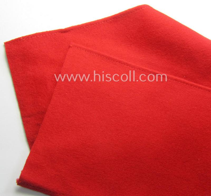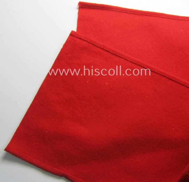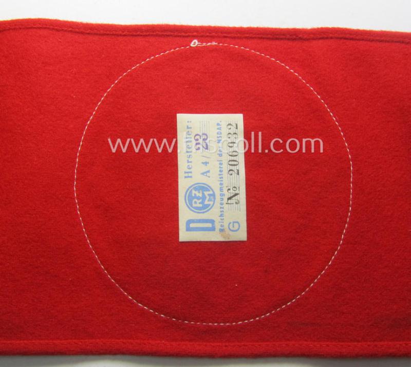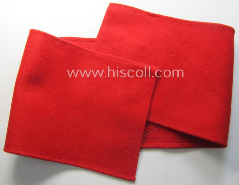 This is a truly very attractive - simply never used and with certainty scarcely encountered! - N.S.D.A.P.-pattern, smooth-woolen-based swastika armband (ie. 'Armbinde') being an example of the so-called: 'Extra Qualität'-type and that comes in an overall very nice- (simply never used- ie. still 'virtually mint'-), condition. The neat piece - which is constructed from the somewhat darker-red-coloured- and/or typical 'smooth-type'- (ie. moleskin-type) wool showing a seperately attached (linnen-based) roundel and (braid-based) swastika as to be expected - comes in a very nice condition overall: it was simply never used nor even stitched-together and measures approximately 49 x 11 cms. The armband is not piped as to be expected and still shows its period-attached, paper-based: 'RzM'-etiket (something that is most certainly not always the case). The armband shows some minimal storage-age only, simply caused by having been stored as such for decades. These generic swastika-armbands were worn on the left upper-arm and were intended for usage by the various N.S.D.A.P.-party-members and/or officials (but were also worn by members of various other Third Reich organisations such as for example the members of the N.S.K.K., RAD, SS and/or SA to mention a few). In any case is this an attractive - and with certainty not that easily encountered! - swastika 'Armbinde' of the 'Extra Qualität' that comes not that often offered for sale. I deem that this acttractive example is accordingly priced!
