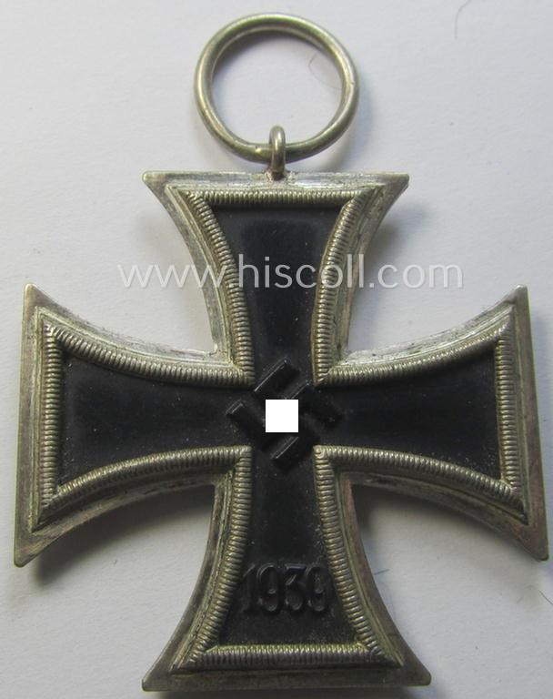 The attractive - and with certainty early-war-period! - award comes together with its folded (never mounted- nor confectioned and full length) bright-red-coloured (and approx. 29 cms. long-sized-) ribbon (ie. 'Bandabschnitt'). The cross - which is void of any makers'-signification as is more often encountered - has never been cleaned nor polished and retains a very nice and attractive age-patina (the piece truly retains most of its so-called: 'hochpolierte Kanten' or: polished sides as can be seen on the pictures). The cross shows a very nicely preserved, black-finished (ie. satin-like) 'core' that is void of any real damage or alike (no paint-loss is noticable as can be seen on the pictures). It does, however, show some dirt- ie. dust but has truly retained pronounced detail. The differences between a 'Schinkel'-form cross - which is in fact a smaller variant as mounted in a WWI-period IC-rim - and a regular type IC can easily be spotted when compared next to a regular format IC. The cross is a typical magnetic example that was (I deem) produced by the: 'Wilhem Deumer'-company. It should be noted that these early-type 'Schinkel'-ICs can easily be graded 'fairly scarce'. Simply a great by the 'Wilh. Deumer'-company produced so-called: 'Schinkel'-IC 2nd class that will be very hard to be upgraded!