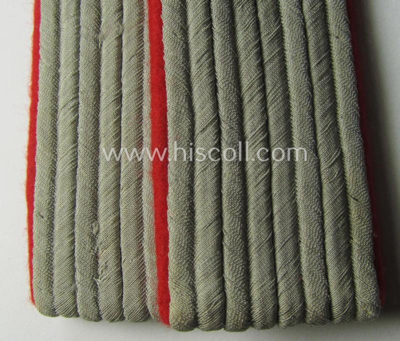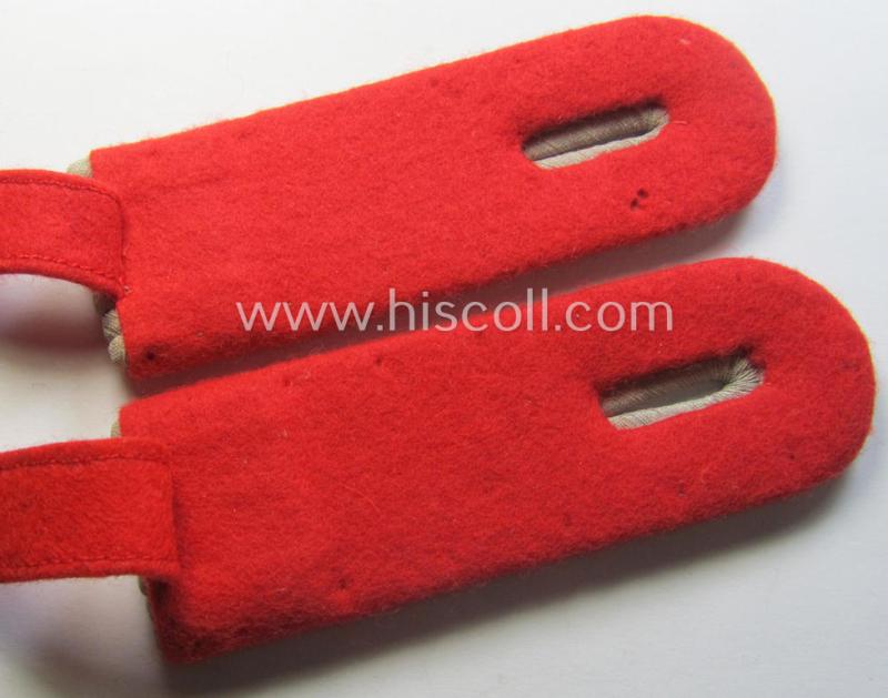 The attractive - and I deem hardly ie. simply never used! - shoulderboard-pair is a typical, 'text-book'-example of the Heeres'-type, officers'-pattern shoulderboards and has the silverish-grey- (ie. somewhat 'sub-dued'-type-) 'upperdecks': the boards were (I deem) issued but simply never worn and do show some minimal storage-age and/or staining only (as can be seen on the pictures). The boards show the desirable bright-red- (ie. 'hochroter'-) coloured (and were constructed from the 'smooth-type'- ie. 'moleskin-type'-wool as to be expected). The boards come mounted onto their (typical) smaller-sized tongues attached (as can be seen on the pictures). The boards measure approximately 10,2 cms. in length each and never had any numerals, pips nor cyphers (ie. 'Ziffern') attached (as can be seen on the pictures) denoting that the junior-officer who wore this set held the rank of a: 'Leutnant' (ie. lieutnant). Taking into account the fact that this pair has the somewhat 'sub-dued'-type 'upperdecks' I deem that it was a pair that was intended to be used on a regular 'front-tunic'. Simply an attractive WH (Heeres) shoulderboard-pair that belonged to a: 'Leutnant eines (Sturm)Artillerie-Regiments o. Abteilungs' and that is with certainty accordingly priced!