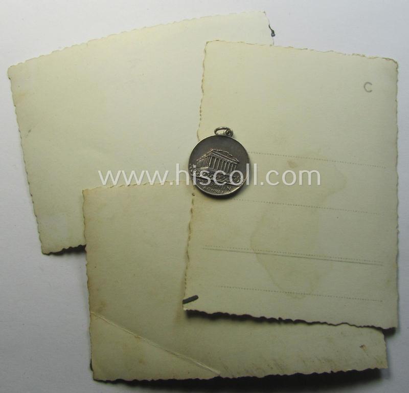 The neat 'souvenir'-hanger (grouping) from the Greek campaign is depicting the famous: 'Parthenon' in Athens and is showing the text: 'Andenken von Athen 1941': it is (I deem) executed in somewhat shiny silver-coloured- (and I deem genuine silver-based!) metal and retains great pronounced detail: it was recently found at a German private-household and came with 3 (smaller-sized and period) photos from the presumed bearer (of which two also show the famous 'Parthenon'). As more often, is the hanger totally void of a makers'-designation or alike but does show a silver-content-marking (that reads: '1000') and is I deem clearly worn ie. used (it is still a bit tarnished and was with certainty never cleaned nor polished). The detail on the engraved illustration is, however, nicely preserved and void of any damage or alike (as can be seen on the pictures). The hanger originates with certainty of a local Greek-production and was most certainly acquired as a souvenir from the Greek campaign in 1941. These 'souvenir'-items could be privately purchased from local artisans and were very popular amongst the troops for obvious reasons. Simply a neat - and 100% genuine! - example that originates from a German private-household where it was recently uncovered. I deem that I have priced this interesting 'souvenir'-hanger & photo-set, accordingly!