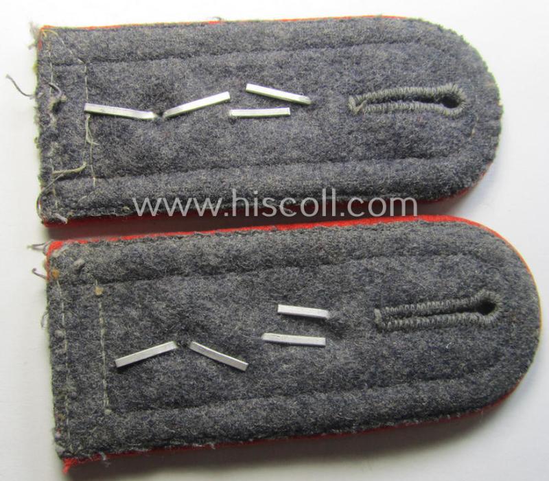 This is a truly attractive - fully matching and actually rarely seen! - pair of neatly 'cyphered', WH (Luftwaffe) NCO-type shoulderstraps as was piped in the neat bright-red- (ie. 'hochroter'-) coloured branchcolour as was specifically intended for usage by a: 'Feldwebel der Flak-Artillerie-Truppen u. Mitglied einer Flak-Artillerieschule' (or: sergeant and presumably instructor who served within an air-force-related, anti-aircraft school) and that comes in an overall nice- (ie. just moderately worn- ie. clearly used- ie. cut-off a tunic-), condition. The neat shoulderstraps - which measure approximately 10,6 cms. in length each and that came without tongues - are as stated above piped in the neat bright-red- (ie. 'hochroter'-) coloured branchcolour and have the woolen-type piping attached. They shows the typical bluish-toned and woolen-based 'upperdecks' (constructed from so-called: LW officers-type cloth!) and were carefully 'cut-off a tunic' (as can be seen on the pictures). The straps show - next to the standard-issued, silverish-toned and 'dotted'-styled LW-pattern NCO-braid - a matching pair of the neat (aluminium-based- and/or: 'Gothic'-styled) so-called: 'FAS'-cyphers and a pair of (also aluminium-based and equally matching) pips period-attached denoting the NCOs rank of: 'Feldwebel' (ie. sergeant). The straps show some clear age, wear and/or staining but are totally void of any real damage or alike. This pair originated from a private-household in Germany and was found together with the similar pair that I offer under number 67879: both attractive pairs were worn by the same LW-NCO who wore these sets and stored them for decades. It should, moreover, be noted that all 'cyphered' LW-straps are truly very hard to find. Simply a great occasion to acquire an attractive - and actually rarely seen! - NCO-type, LW-shoulderstrap-pair that was intended for usage a: 'Feldwebel der Flak-Artillerie-Truppen u. Mitglied einer Flak-Artillerieschule'!