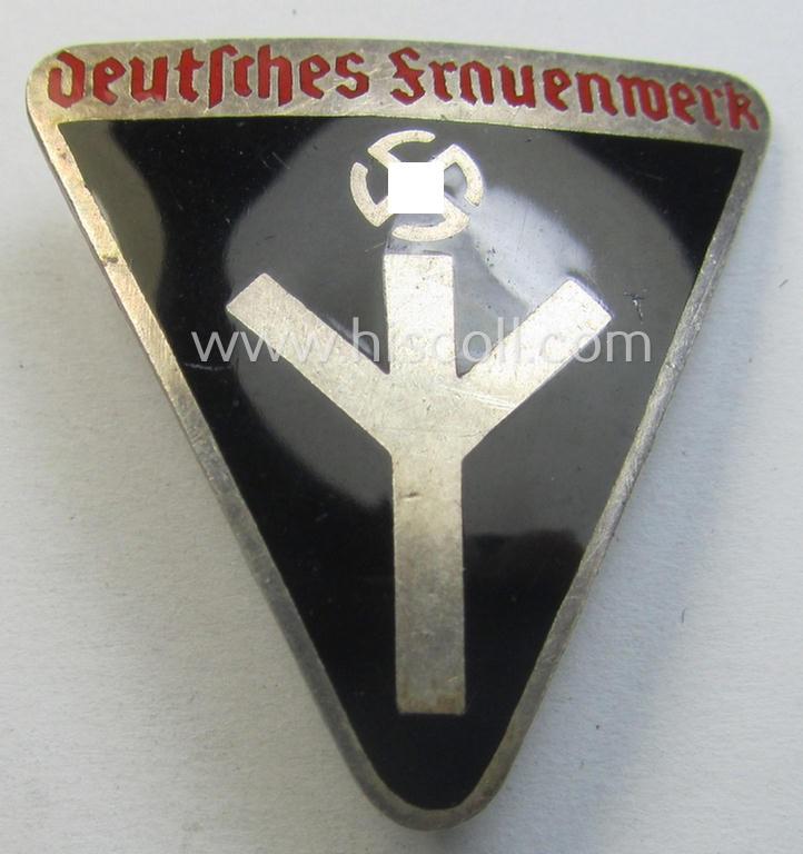 This particular enamelled 'NS-Frauenschaft'-membership-badge (ie. 'Mitgliedsabzeichen') was intended to signify membership within the German Womens'-Association (or in German-language: 'NS-Frauenschaft'). The example on offer here is the regular-sized version of the series and measures approximately 3 cms. in height (as can be seen on the pictures). The badge comes in an overall very nice and - I deem - hardly- ie. only minimally used- ie. worn, condition: the enamelled surface truly shows no enamel damage whatsoever. The badge shows a clearly present: 'RzM M1/72'-designation on its back (as is more often seen as can be seen on the pictures). A similar piece is also figured in the 'Heering-Hüsken'-lapel-pin-catalogue wherein it is given a unique reference-number ('9125KA'). Simply an attractive and neatly enamelled, 'NS-Frauenschaft-Mitgliedsabzeichen' that is I deem accordingly priced!
