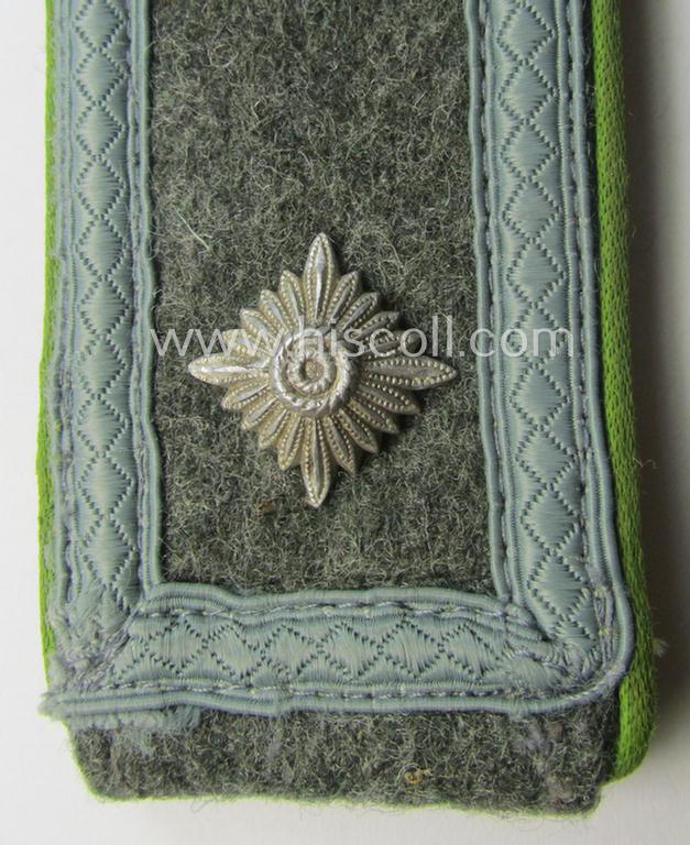 This is a truly attractive - albeit single but nevertheless fairly scarcely encountered! - WH (Heeres) (I deem) early- (ie. mid-)war period- (ie. 'M40- o. M43'-pattern) NCO-type shoulderstrap as was piped in the desirable bright-green- (ie. 'wiesengrüner'-) coloured branchcolour, as was specifically intended for usage by a: 'Feldwebel der Panzer-Grenadier-Truppen' (ie. NCO and sergeant who served within an infantry-related, so-called: rifle-regiment ie. unit) and that comes in an overall very nice- (albeit just moderately used- ie. worn-), condition. The neat shoulderstrap - which measures approximately 12,3 cms. in length - has the typical field-grey-coloured- and/or woolen-based 'upperdeck' and has the neat (and desirable!) bright-green- (ie. 'wiesengrüner'-) coloured- and/or desirable 'silk-like'-type, piping, attached. The strap comes mounted onto its period tongue and does show some obvious wear, usage and/or minimal age. The strap has the 'standard'-type, bluish-grey-coloured (ie. 'sub-dued'-type) 'Heeres'-NCO-braid and a single (regular-sized, aluminium-based) pip period-attached denoting that the bearer held the rank of a: 'Feldwebel' (ie. sergeant). Simply an attractive - and actually scarcely found! - NCO-type 'Panzergrenadiere'-shoulderstrap that belonged to a: 'Feldwebel der Panzer-Grenadier-Truppen': too bad that it is only a single specimen!