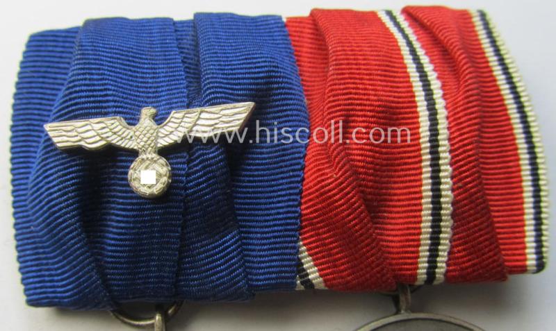 This is a very decorative - and with certainty not that easily found! - example of a two-pieced, WH (Heeres or: Kriegsmarine-related-) two-pieced medal-bar (ie. 'Ordenspange' or: 'Doppelspange') respectively showing a: 'WH (Heeres o. KM) Dienstauszeichnung der 4. Stufe' (as was intended for 4 years of loyal-service) and that shows a detailed, eagle-device period-attached and a so-called: Austrian 'Anschluss'-medal, both medals coming in an overall very nice- (albeit minimally used and/or worn-), condition. Both medals are truly very very nicely preserved examples that seem to have never been cleaned nor polished: both come in an equally minimally tarnished- ie. dusty condition and naturally also come mounted onto their period ribbons. The 'WH-Dienstauszeichnung 4. Stufe' retains nice details and has a great ie. only minimally darkened- ie. tarnished age-patina: it retains all of its somewhat 'matted'- and/or: silver-toned finish (as can be noticed on the pictures). The 'Anschluss'-medal retains also all of its original, bright-silver-toned finish: it is also a tiny bit dirty ie. tarnished, simply caused by minimal wear and/or decades of storage (as can be noticed on the pictures). The 'Spange' comes naturally mounted onto its functional pin- (ie. catch-) set-up and is nicely 'backed' with a piece of darker-green-coloured wool as is more often seen (as can be seen on the pictures). The medal-bar - that is of the desirable 'detachable'-pattern! - was recently found at a private-household in Germany and was never before part of a collection. The 'Spange' is most certainly a period-compiled- and/or worn piece and is NOT a post-war compilation or alike: it originated as stated above from a private-household in Germany and was kept as such for decades. Simply a very attractive - and decorative! - 2-pieced, WH (Heeres o. KM) related medal-bar- ie. 'Doppelspange' that is in my opinion accordingly priced!