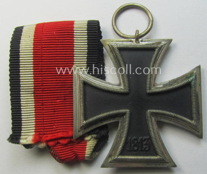 The attractive piece - which was surely issued and that was once mounted - came together with its folded and/or confectioned, darker-red-toned (and approx. 18,5 cms. long-sized-) ribbon (ie. 'Bandabschnitt') as issued and/or found. The cross - which is totally void of any makers'-designation - was with certainty never cleaned and has an untouched and/or attractive age-patina: it also retains a fair bit of its so-called: 'hochpolierte Kanten' (or: polished sides) and has just a minimally darkened- (ie. stained or tarnished) finish (as can be seen on the pictures). The cross has a very nicely preserved, black-finished (ie. somewhat 'satin-like'- ie. somewhat matted-) core: it is totally void of any damage nor paint-loss (as can be seen on the pictures). The piece is just a tiny bit dusty and/or stained but was never cleaned nor polished. This IC was recently found at a German private-household and was never before in collectors'-hands. Simply an attractive, non-maker-marked 'EK II. Klasse' that is (I deem) accordingly priced!