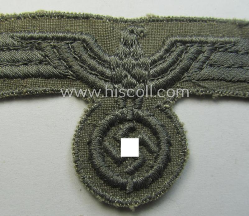 This is a neat - and I deem never tunic-attached! - example of a later-war-pattern, WH (Heeres) breasteagle (ie. 'Brustadler für Mannschaften u. Unteroffiziere') being of the 'last-ditch'- (ie. later-war-period-) and neatly machine-embroidered-pattern and that comes in an overall very nice- (ie. 'virtually mint- ie. unissued'-), condition. These (somewhat roughly-embroidered) versions of the 'standard-pattern' army-type breasteagle were introduced in late 1944 ie. beginning 1945 and saw only limited usage. They are sometimes found on the - battle-dress like-model-, so-called: '1944-type' Heeres tunics. The piece on offer here comes in a simply never used example that just shows some minimal storage-age only (as can be seen on the pictures). Simply a neat - and not that easily encountered! - WH (Heeres) breast-eagle that comes in a wonderful condition!