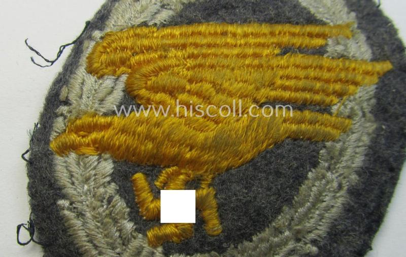 WH (Luftwaffe) 'Fallschirmschützen-Abzeichen in Stoff' (or: cloth-based paratroopers' jump-badge) that is nicely machine-embroidered and being of the so-called: 'padded version'