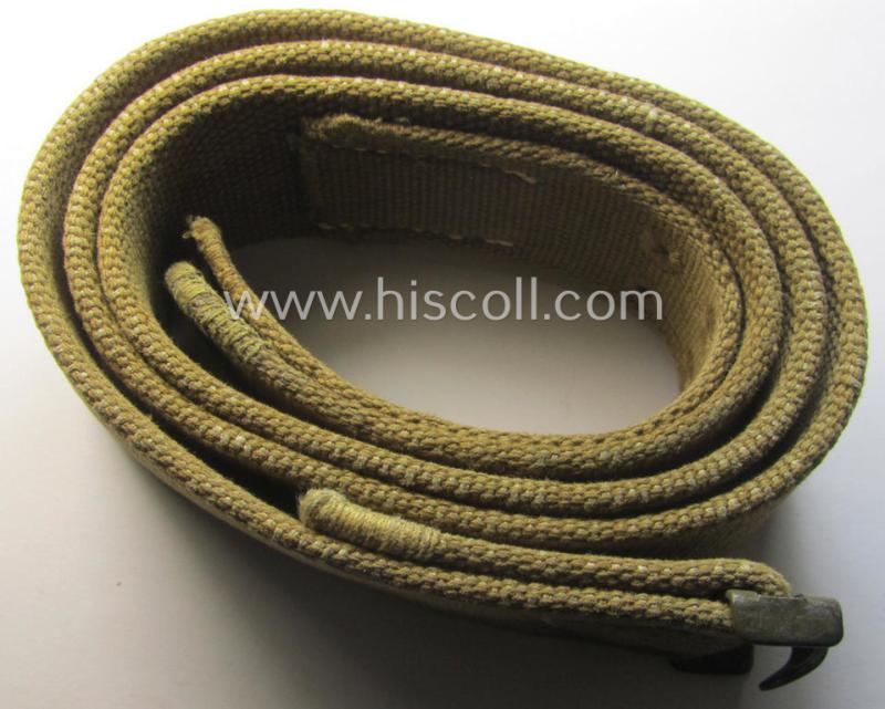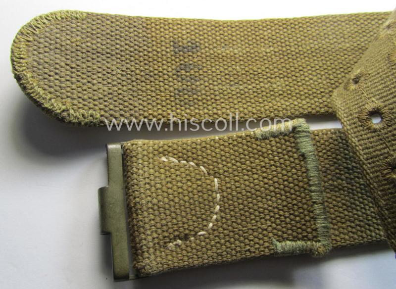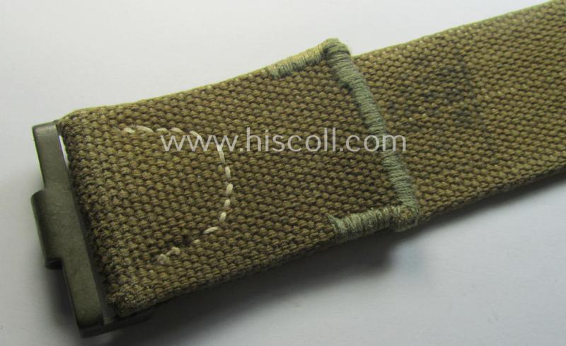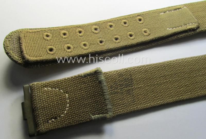 This is an attractive - and I deem only minimally or even never used! - example of a WH (Heeres ie. Luftwaffe etc.) 'tropical-issued'- and/or entirely 'web-based' belt (ie. 'Koppelriemen') as was executed in greenish-tan-coloured and/or neatly woven linnen (ie. 'webbing') and having a linnen-based tongue, being a neat example that is approximately 100 cms. sized and that comes in an overall very nice- (ie. most certainly issued- albeit minimally used- ie. worn-), condition. The belt shows a (somewhat vaguely present and regrettably hard to read) stamped makers'-designation ie. 'RbN'-numeral (which is impossible to decypher as can be seen on the pictures) and does show a blue inked size-stamp under the tongue (that reads: '100') as can be seen on the pictures. The belts'-tongue is as stated fabricated in typical, greenish-coloured linnen (as can be seen on the pictures). The piece was just moderately used and its overall condition is still very nice and of course fully functional. The metal-based catch retains most of its greenish- ie. typical field-grey-coloured finish. Hard to find a more nicely preserved and/or attractive example for a more interesting price: the belt just needs an equally nicely preserved 'Heeres' ie. 'Luftwaffe'-type belt-buckle to complete it. I deem that this nicely preserved example is accordingly priced!