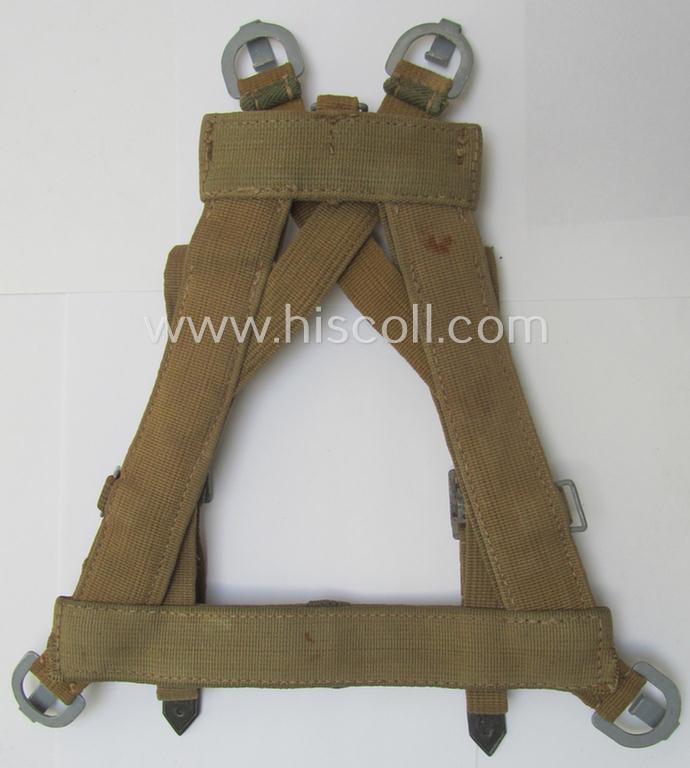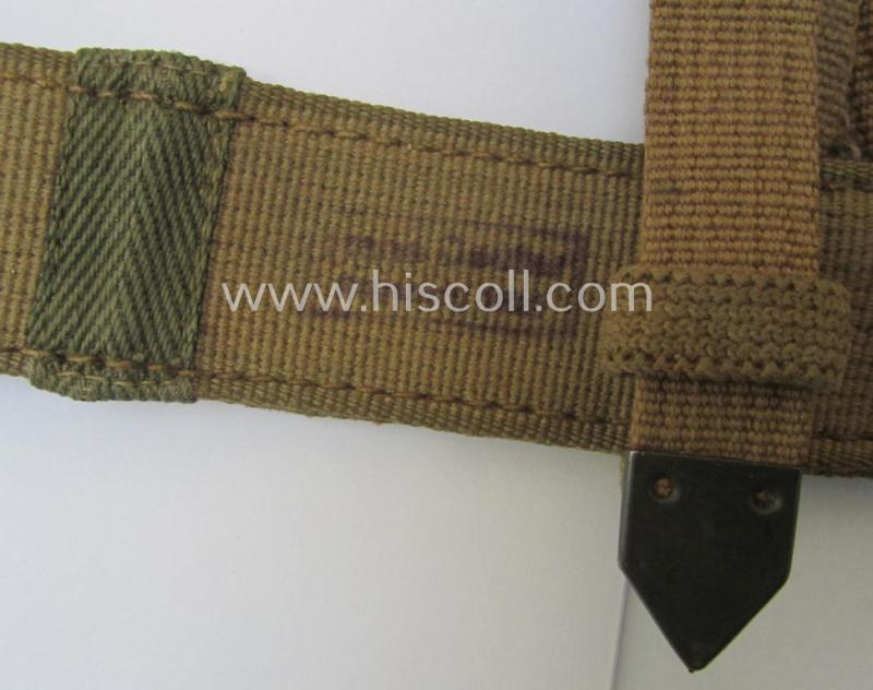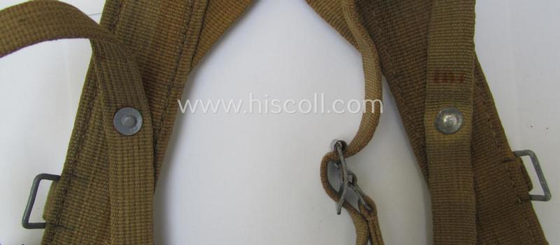 This is a truly attractive - hardly used and with certainty fairly scarcely seen! - I deem early- (ie. mid-war-) period- and 'all-linnen'-based, specific 'tropical-issue'-pattern, WH 'A-Rahmen' (ie. 'Gefechts- or 'Sturmgepäck' aka 'A-frame') that comes in a fully complete and/or totally untouched, condition. The frame comes naturally complete with all its linnen-based lashes, metal-based loops and tan-coloured linnen-based straps present and in place. The frame - which was recently found at a private-household in Germany - is of the specific 'tropical'-pattern which saw usage within the 'Afrikakorps' (but saw further usage throughout the war). The 'pack' is naturally fully functional and complete and does show a (surely present but impossible to decypher) makers'-designation- ie. date-stamp: this might, however, been 'washed-away' during moderate usage and/or wear (as can be seen on the pictures). The 'pack' is only minimally used and does show some minimal (rust)staining but is totally void of any damage or alike. Both its (blank) metal-based rivets are original to the frame and are not re-mounted-, re-rivited or alike). This example was surely issued and/or used, and can - I deem - be graded as a truly DAK- (ie. 'Afrikakorps'-) related item. All metal parts still retain (most of) their greyish-toned (ie.anodized) finish but do show some minimal staining. Simply an attractive - and nowadays scarcely seen! - piece of 'tropical'-issued WH-equipment that is I deem accordingly priced!