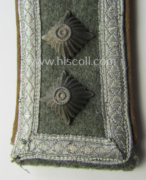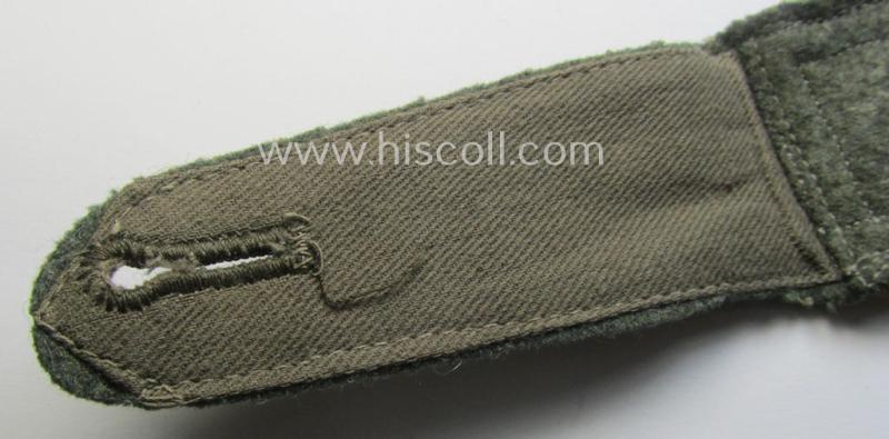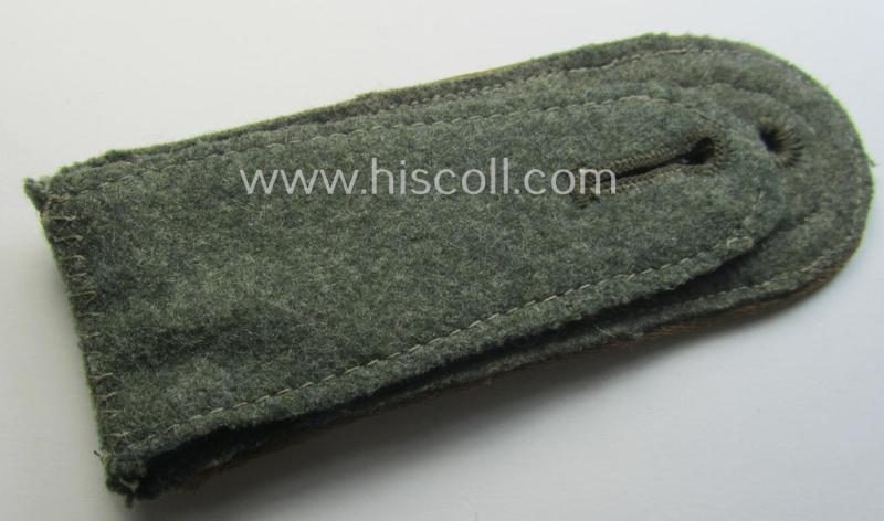 This is an attractive - albeit regrettably single but nevertheless still very scarcely seen! - (I deem) early- (ie. mid-war-) period, so-called: 'M40 o. M43'-pattern, WH (Heeres) NCO-type shoulderstrap as was piped in the desirable copper-brown- (ie. 'kupferbrauner'-) coloured branchcolour as was intended for usage by an: 'Oberfeldwebel u. Mitglied des Kradschützenbtle. der Pz. Div. u. Inf. Divisione (mot)' (or: NCO and sergeant first-class who served within within one of the motorised motorcycle-reconnaissance battalions) and that comes in an overall nice- (albeit moderately used- ie. just moderately worn-), condition. The shoulderstrap - which measures approximately 11,6 cms. in length as more often seen - has the neat (and desirable!) 'silk-like'-type piping attached (as is more encountered with these early- (ie. mid-war-) period shoulderstraps). The shoulderstrap - which originates from a larger cloth- and insignia-collection I recently acquired for the web-site - shows the silverish-grey-toned (ie. non-sub-dued) NCO-braid and two (regular-sized, zinc-based) pips period-attached and comes mounted onto its functional tongue (as can be noticed on the pictures). Simply an attractive - and/or fully 'text-book'! - 'M40- o. M43'-pattern, NCO-type 'Kradschützen'-related shoulderstrap that was intended for usage by an: 'Oberfeldwebel u. Mitglied des Kradschützenbtle. der Pz. Div. u. Inf. Divisione (mot)'!