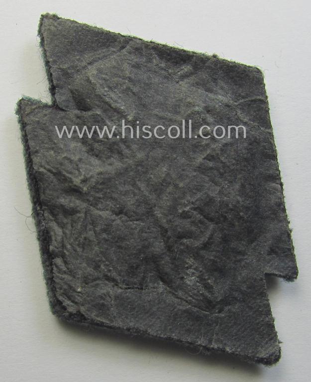 This is a truly very attractive - and actually not that easily encountered! - 'Polizei- o. SS'-related cloth-based item: a neatly hand-embroidered and typical officers'-pattern, breast-runes-badge (ie. 'SS-Runen Brustabzeichen für Offiziere der Schutzpolizei') as was executed on field-grey-coloured wool and that was intended to signify former-service within the SS and that comes in an overall very nice- (I deem probably issued- albeit simply never used- nor tunic-attached-), condition. The patch on offer here is very nicely hand-embroidered in (bright!) silver-coloured braid (ie. 'Metallfaden gestickt') and shows excellent craftmenship having stunning detail. The piece is void of a (paper-based) 'RzM-etiket' and is nicely 'backed' with typical black-coloured thin-shaped paper (something that is more often encountered). Simply a nice example of a 100% authentic 'SS'- ie. 'Schutzpolizei'-related cloth-insignia piece that is priced according to its wonderful and simply never tunic-attached condition!