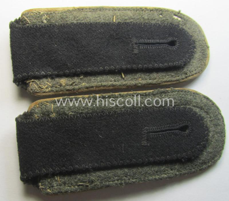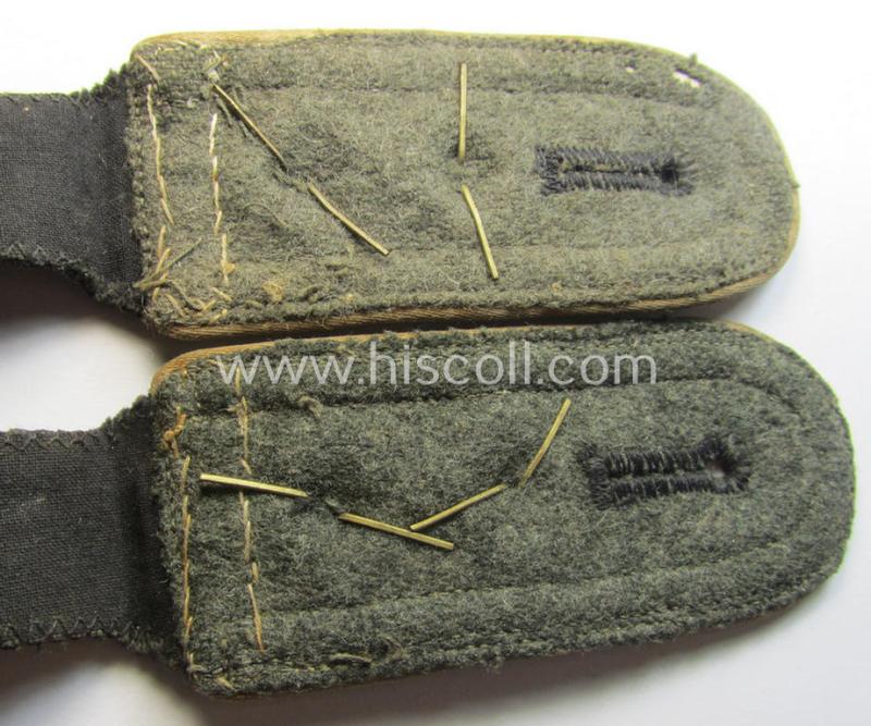 This is a truly very attractive - fully matching, very desirable and with certainty rarely found! - pair of Waffen-SS NCO-type shoulderstraps (ie. 'Schulterstücke für Unterführer der Waffen-SS') as was piped in the neat white- (ie. 'weisser'-) coloured branchcolour as was specifically intended for usage by an NCO (ie: 'Hauptscharführer' or: sergeant first-class) who served within the: 'Waffen-SS Infanterie-Truppen' (or: infantry troops) and that comes in an overall very nice- (albeit clearly ie. moderately used- and/or worn-), condition. The straps - which come mounted onto their original and/or typically 'SS'- ie. smaller-shaped tongues as more often encountered on genuine Waffen-SS-type shoulderstraps - have the white- (ie. 'weisser'-) coloured and/or: desirable 'silk-like'-type piping (as can be seen on the pictures). The backs of the straps (which measure 10,7 cms. in length as more often encountered) are executed in the field-grey-coloured wool, as is more often observed with genuine Waffen-SS-type shoulderstraps. The pieces - which can I deem be dated around 1941/42 - show some moderate age, wear and/or staining (as can be seen on the pictures). The pair shows the ('standard-issued'-pattern) silverish-coloured NCO-braid and two pairs of (fully matching, regular-sized and zinc-based) pips period-attached denoting that they were intended for usage by a senior-NCO holding the rank of a: 'Hauptscharfüher' (ie. sergeant first-class). Of additional interest is, moreover, the fact that the NCO who wore this pair was most certainly (field)promoted: something that can easily be corroborated by the presence of the somewhat later, horizontally-mounted piece of NCO-braid (as can be noticed on the pictures). Simply a very attractive - and fully 'text-book'! - Waffen-SS-related, NCO-type 'Infanterie'-related shoulderstrap-pair that is priced according to its unmistaken rarity and/or desirability!