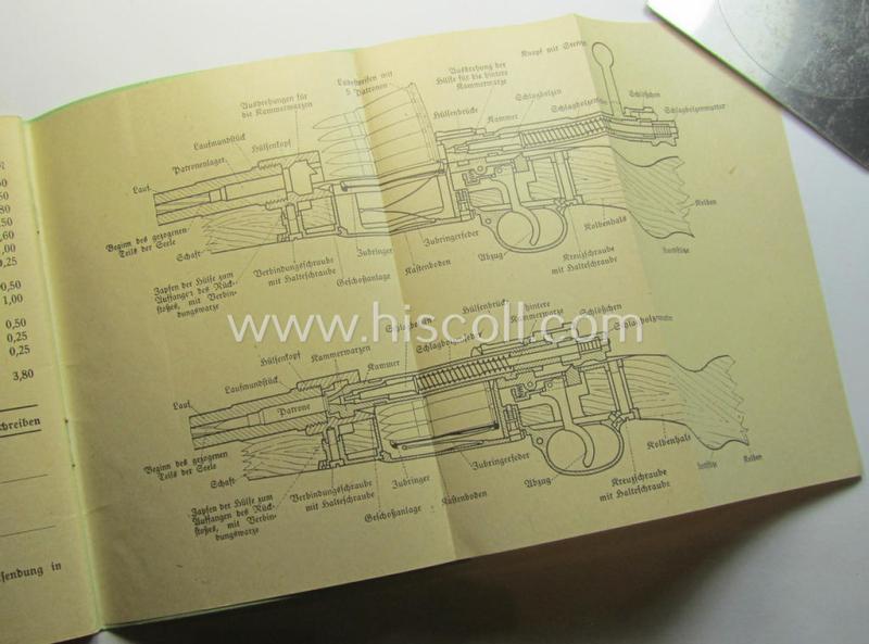 I recently uncovered a few examples originating from the extensive series of interesting (period) military-related publications as were all published by the 'Heinz Denckler Verlag' as based in Berlin: some of the titles I never encountered before and I decided to sell them seperately. The example on offer here is entitled: 'Der Karabiner' (and sub-titled: 'Mit Reinigungsgerät 34 und Seitengewehr mit 33 Abbildungen und 1 Tafel' (which can freely be translated as: 'the WH carabine K98 and everything that is related to this topic') and that comes in a wonderful - and only minimally used- ie. read-, condition. This example (only sized: 15 x 10,5 cms.) is fully complete and retains all its original 45 pages (of which some are nicely illustrated): it is just somewhat yellowed (ie. dusty) caused by normal age ie. storage for decades. Of additional interest is, moreover, the fact that this example still retains its to be folded-out 'overview-illustration' of a rifle ie. carabine). As possibly known has this booklet also been reproduced: this is naturally a fine original and/or period example. These sought-after publications - as published by the 'Heinz Denckler Verlag' based in Berlin - were not 'standard-issue' but had to be privately acquired by the soldiers and/or members of the various TR-organisations. Simply a nice - and fairly scarcely encountered! - TR-period publication that would make a great addition to any field-gear/mannequin set-up or manual-collection!