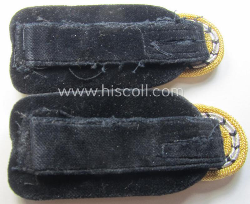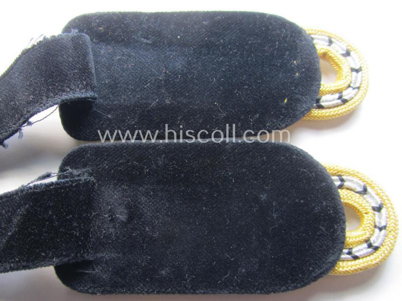 The truly attractive - fully matching and with certainty rarely encountered! - pair of RAD- (ie. 'Reichsarbeitsdienst') general-officers'-pattern shoulderboards (ie. 'Schulterstücke für höhere Führer o. Generalarbeitsführer des Reichsarbeitsdienstes') was intended for usage by a high-ranked RAD-general-officer (ie. 'Generalarbeitsführer') and comes in an (I deem) just moderately used- and/or carefully tunic-removed-, conditon. The boards on offer here are of the third- (and final) pattern type (as was used between the years 1941 and 1945) and is constructed from the specific, black-coloured- and/or: typical 'velvet'-type wool and having the (typical) golden-toned (and/or 'Cellueon'-based) upperdecks showing the silver-toned braid (having the typical black-toned, center-thread) as can be seen on the pictures. The attractive pair was I deem used as such and was I deem once tunic-attached: it just shows some minimal age ie. staining simply caused by minimal wear and/or decades of storage (as can be seen on the pictures). This interesting shoulderboard-pair originated from a smaller RAD-related insignia-collection I recently acquired for the web-site. It should be noted that these RAD-related, general-officers'-type shoulderboard-sets as were intended for: 'RAD-Führer des höhere Dienstes o. Generalarbeitsführer' can easily be graded: 'rare'. I deem that this very attractive pair is accordingly priced!