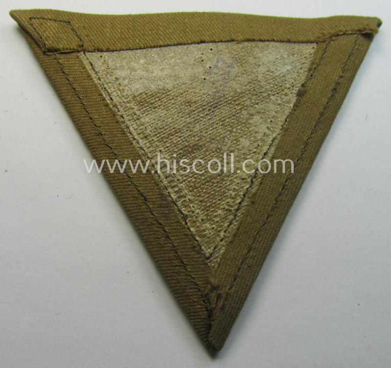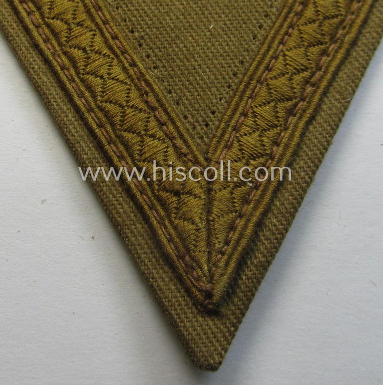 This is an attractive - and I deem simply never used nor worn! - example of a WH (Heeres), typical tropical-issue 'Armwinkel' (ie.: arm-chevron) as was executed on a typical, reed-green-coloured- (and/or somewhat thicker-styled) background as was intended for usage by a soldier with the rank of: 'Gefreiter' (ie. private first-class) and that comes in an overall very nice- (and I deem 'virtually mint- ie. unissued'-), condition. The chevron is neatly executed and shows a single stripe of golden-yellow-coloured- (ie. truly 'sub-dued') and/or 'standard'-tropical-pattern NCO-braid (as can be seen on the pictures). The piece shows an unusually seen, buckram-based backing (as can be seen on the pictures). It sounds maybe strange but these 'simple', tropical-styled Heeres-related rank-insignia are quite hard to encounter. Simply an attractive tropical WH-rank-badge that is I deem accordingly priced!