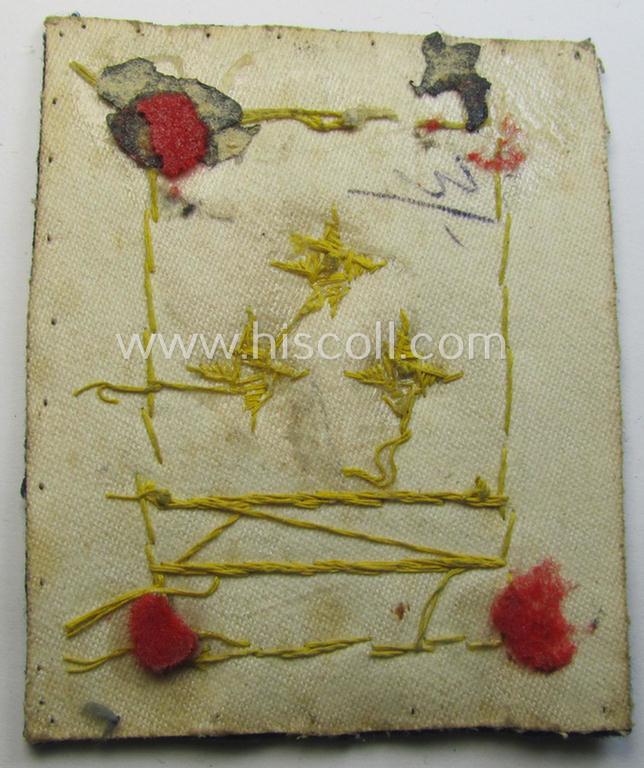 This is an attractive - regrettably single but nevertheless fairly rarely encountered! - example of an NJS- (or: 'Nationale Jeugdstorm'-) related collar-patch (or in Dutch language: 'NJS-kraagspiegel voor officieren') being an attractive and detailed, hand-embroidered example that was intended for officers'-usage by a member holding the rank of a: 'Hoofdhopman' and that comes in an overall very nicely preserved- (and I deem never used- nor worn-), condition. The attractive patch - which is executed in (bright) golden-toned braid on a typical, darker-blue-coloured- and/or felt-woolen-based background - measures approximately: 8 x 6,7 cms. shows three, golden-toned- and 'braid'-based stars and a double (identically-styled) rank-stripe (as can be seen on the pictures). The piece was presumably never worn nor once tunic-attached (it was even never folded into shape) but comes in a truly very nicely preserved condition without showing any defaults: it is neatly backed with a piece of beige-white-coloured linnen (as can be seen on the pictures). This NJS-officers'-collar-patch originates from an advanced collection of NSB- ie. Dutch collaboration-related items that I recently acquired for the web-site. Simply a very attractive - and truly rarely found! - NJS- (or: 'Nationale Jeugdstorm'-) related 'NJS-kraagspiegel voor officieren' ie. 'Hoofdhopman' that is with certainty accordingly priced: only the first such neat NJS-item I ever had on offer!