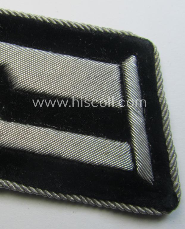 The truly attractive - regrettably single but nevertheless extremely rarely encountered! - TR-period hand-embroidered, officers'-type collar-tab (ie. 'Kragenspiegel für Offiziere') was (in my opinion) intended for a high-ranked officer serving within the: 'Reichsministerium für die besetzten Ostgebiete (o. RMfdO)' (ie. the Reichs Ministry for the Occupied Eastern Territories in the former USSR) and that comes in a (I deem) just moderately used- and/or presumably tunic-removed-, conditon. The collar-tab on offer here is constructed from the specific, black-coloured- and/or: typical 'velvet'-type woolen-based cloth. The tab shows extraordinary hand-embroidery and is constructed from (bright) silver-toned 'braid' as to be expected (as can be seen on the pictures). The attractive collar-tab - which shows a beige-brownish-coloured- and/or carton-based 'backing' was (I deem) used as such and was once tunic-attached: it just shows some minimal age ie. staining simply caused by fair wear and/or decades of storage (as can be seen on the pictures). This interesting collar-tab originated from an extensive insignia-collection I recently acquired for the web-site. It should be noted that these RMfdO-related, officers'-type collar-tabs can easily be graded: 'extremely rare'. Too bad that it is only a single specimen!