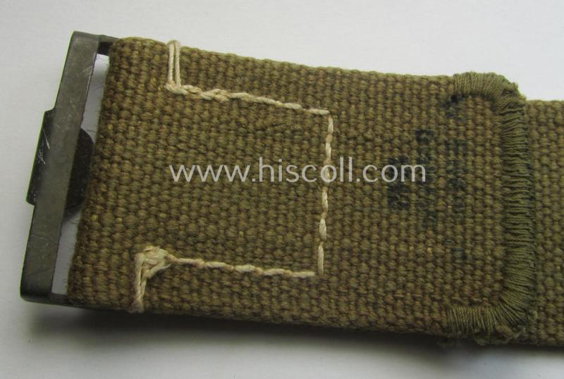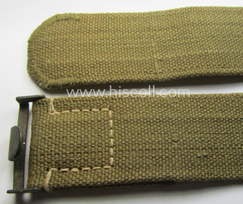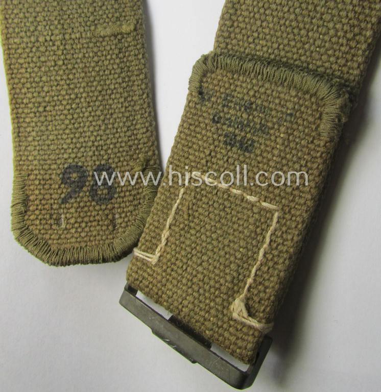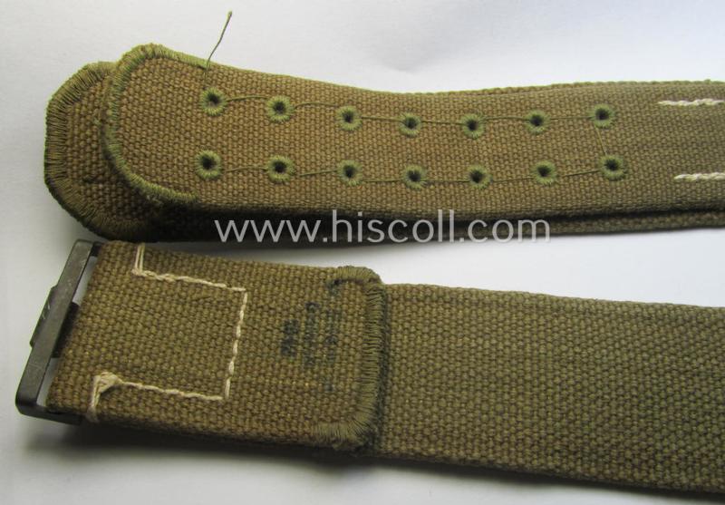 This is an attractive - and I deem only minimally or even never used! - example of a WH (Heeres ie. Luftwaffe etc.) 'tropical-issued'- and/or entirely 'web-based' belt (ie. 'Koppelriemen') as was executed in greenish-tan-coloured and/or neatly woven linnen (ie. 'webbing') and having a linnen-based tongue, being a neat example that is approximately 98 cms. sized and that comes in an overall very nice- (ie. most certainly issued- albeit minimally used- ie. worn-), condition. The belt shows a (somewhat vaguely present and regrettably hard to read) stamped makers'-designation (which is impossible to decypher as can be seen on the pictures) and does show a blue inked size-stamp under the tongue (that reads: '98') as can be seen on the pictures. The belts'-tongue is as stated fabricated in typical, greenish-coloured linnen (as can be seen on the pictures). The piece was just minimally used and its overall condition is still very nice and of course fully functional. The metal-based catch retains most of its greenish- ie. typical field-grey-coloured finish. Hard to find a more nicely preserved and/or attractive example for a more interesting price: the belt just needs an equally nicely preserved 'Heeres' ie. 'Luftwaffe'-type belt-buckle to complete it. I deem that this nicely preserved example is accordingly priced!