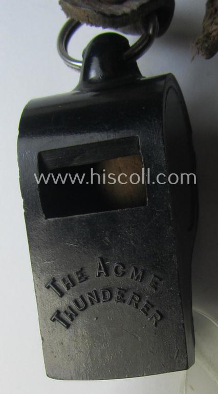 This is a neat - and actually not that commonly encountered! - WH (Heeres, Kriegsmarine etc.) personal-equipment-item: a genuine period, black-coloured- and (I deem) 'Bakelite'- (ie. resin-) based flute (ie. 'Dienstflöte') of the (foreign!) company ie. type named: 'The Acme Thunderer' that comes mounted onto its original (brownish-coloured- and/or leather-based) lanyard (ie. tab) and that comes as issued and/or recently found. These flutes were 'standard'-equipment items for all WH-non-commissioned-staff (ie. NCOs) and were used during exercises, training as well as during battle at the front. The lanyard ie. tab - as well as the flute - show some moderate wear and usage but nothing too shocking (as can be noticed on the pictures). Simply a neat WH personal-equipment-item that comes in a nicely preserved condition and that is I deem accordingly priced!