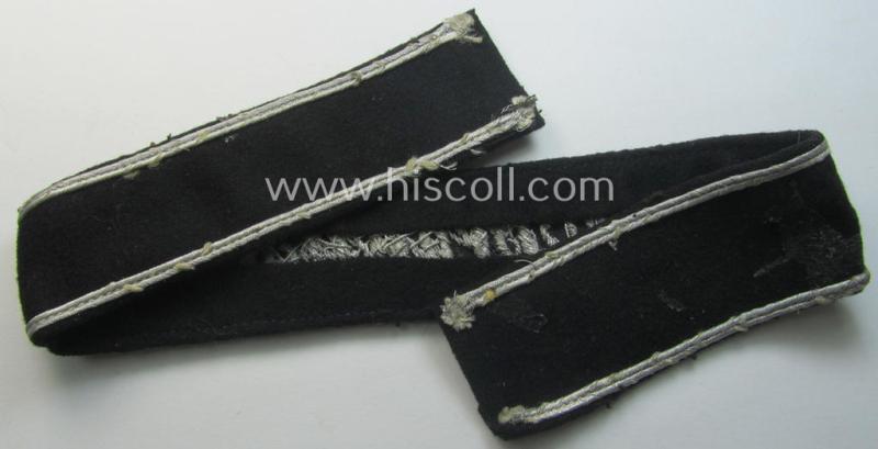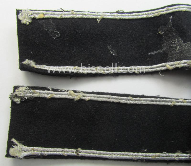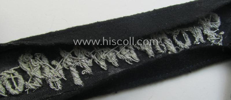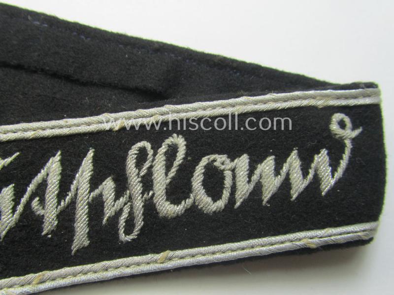 This is a truly attractive - and actually not that often seen! - I deem full-length (and most certainly once tunic-attached and clearly worn!) example of a WH (Heeres) cuff-title ie. armband (ie. 'Ärmelstreifen') entitled: 'Grossdeutschland' being a neatly hand-embroidered 'standard-issue'-pattern example (of I deem the first pattern that was used throughout the war) that was specifically intended for officers'- (ie. evt. NCO-) usage (ie. 'Ärmelstreifen für Offiziere') and that comes in an overall very nice- (ie. most certainly issued- and/or clearly worn- ie. once-tunic-attached-), condition. The (I deem hardly- ie. non-shortened) cuff-title measures approximately 39 cms. in length and comes as recently found. The cuff-title - which does show some moderate age, obvious wear and/or staining - is executed onto black-coloured 'smooth-like'-type wool and shows the (very nicely!) hand-embroidered (ie. 'Schreibschrift'-styled) text entitled: 'Grossdeutschland' as executed in silverish-coloured braid as to be expected: as such does it deal with a typical example of the first-pattern that was intended for commisioned-staff ie. being an: 'Ausführung für Offiziere'. Both ends do show some obvious fraying and usage and the piece was in my opinion once glued and shows some minimal glue-staining (as can be seen on the pictures). The band still shows some of its thread- (ie. stitching-) remains with which it was once tunic-attached (as can be seen on the pictures). Simply a very attractive - and naturally 100% genuine, period example! - that really shows character and that is priced according to its obvious scarcity and/or desirability!