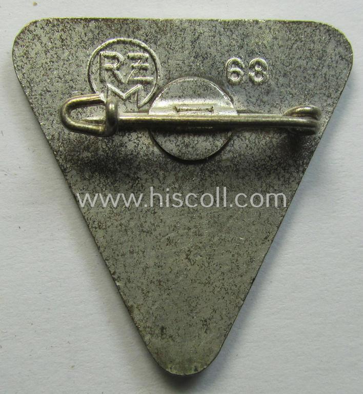 This particular - neatly enamelled and actually quite scarcely found! - 'NS-Frauenschaft'- (ie. NSF-) membership-badge (ie. 'Mitgliedsabzeichen') was intended to signify membership within the German Womens'-Association (or in German-language: 'NS-Frauenschaft') and that was specifically intended for usage by a medium-ranked NSF-official holding the rank of a so-called: 'Frauenschaftsleiterin der Kreisleitung' and that comes in an overall very nice- (and just moderately used- ie. worn-), condition. The example on offer here is one of the regular-sized versions of the series and measures 38 mm. in height (as can be seen on the pictures). The badge comes in an overall very nice and (I deem) only moderately used- ie. worn, condition: the enamelled surface shows some minimal scratches but is totally void of any enamel damage whatsoever (as can be noticed on the pictures). The badge shows a clearly present, superimposed: 'RzM 63'-designation on its back: the black enamelled outer 'rim' denotes that the female official who wore this served at: 'Kreis'-level (as can be noticed on the pictures). An identical piece is also figured in the 'Heering-Hüsken'-lapel-pin-catalogue wherein it is given a unique reference-number ('9125MD'). Simply a very attractive - and actually scarcely encountered! - neatly enamelled 'NS-Frauenschaft-Mitgliedsabzeichen' that is (I deem) accordingly priced!