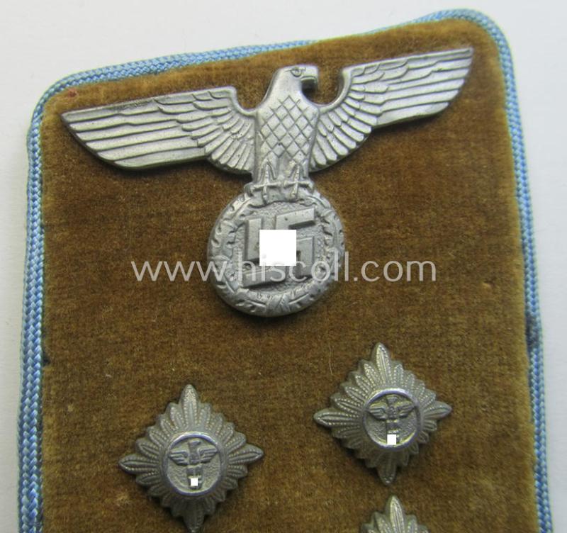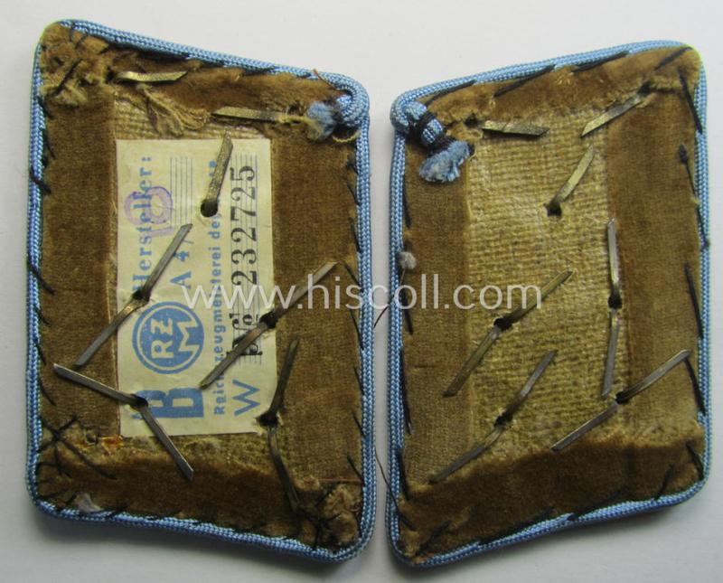 This is an attractive - fully matching and actually scarcely encountered! - pair of N.S.D.A.P.-type, smooth-woolen-based collar-patches (ie. 'Kragenspiegelsatz für politischen Leiter') being of the third- and final pattern as was used from 1941 onwards as was specifically intended for usage by an: 'N.S.D.A.P.-Obergemeinschaftsleiter' at 'Orts'-level and that comes in an overall very nice- (ie. I deem just moderately used- and/or carefully tunic-removed-), condition. The neat pieces - which are constructed from the golden-brown-coloured- and/or typical 'smooth-type'- (ie. velvet-type-) wool - come in a wonderful condition overall: they show a (matching!) pair of greyish-coloured eagle-devices, four (equally greyish-toned) pips and a single piece of golden-toned rank-braid period-attached. The tabs are piped with light-blue coloured- and rayon-based piping (as always) signifying that the pair was intended for a party-official serving at: 'Orts'-level. One of the tabs - still shows its period-attached, paper-based 'RzM'-etiket (ie. 'B-Stück') as issued. The pair shows some (truly non-disturbing) tarnish (all metal devices were once golden-toned and have 'migriert' over the years as more often): the pair shows some minimal wear and aging caused by having been stored for decades (as can be noticed on the pictures). In any case is this a neat and fairly unusually encountered N.S.D.A.P.-collar-tab-set that is not that often offered for sale. Only the second such neat N.S.D.A.P.-related collar-tab-set in this particular rank I ever had on offer!