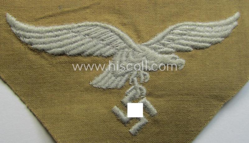 This attractive - and simply never used- nor confectioned! - example is neatly greyish- (ie. silver-white-) coloured- and is executed on a (slightly thicker-shaped) tropical-styled, light-brownish- (ie. typical tan-) coloured and/or also linnen-based, background. The piece comes - as stated above - in an overall very nice and/or simply never used- nor confectioned condition (as can be seen on the pictures). The piece - which measures from wing-tip to wing-tip approximately 9,4 cms. - is just a tiny bit stained and does show some minimal staining as caused by years of storage only but has maintained very nice detail overall. The piece was simply never trimmed- nor folded and can as such easily serve to restore any tropical LW-type-shirt. These 'tropical' (ie. DAK or 'Deutsches Afrika Korps') breasteagles as intended for the tropical-shirts can easily be graded 'scarce'. Simply a very attractive example that will be impossible to be upgraded!